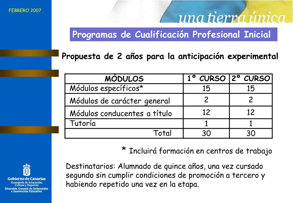 FEBRERO 2007 Programas de Cualificación Profesional Inicial Propuesta de 2 años para la anticipación experimental * Incluirá formación en centros de trabajo Destinatarios: Alumnado de quince años, una vez cursado segundo sin cumplir condiciones de promoción a tercero y habiendo repetido una vez en la etapa.