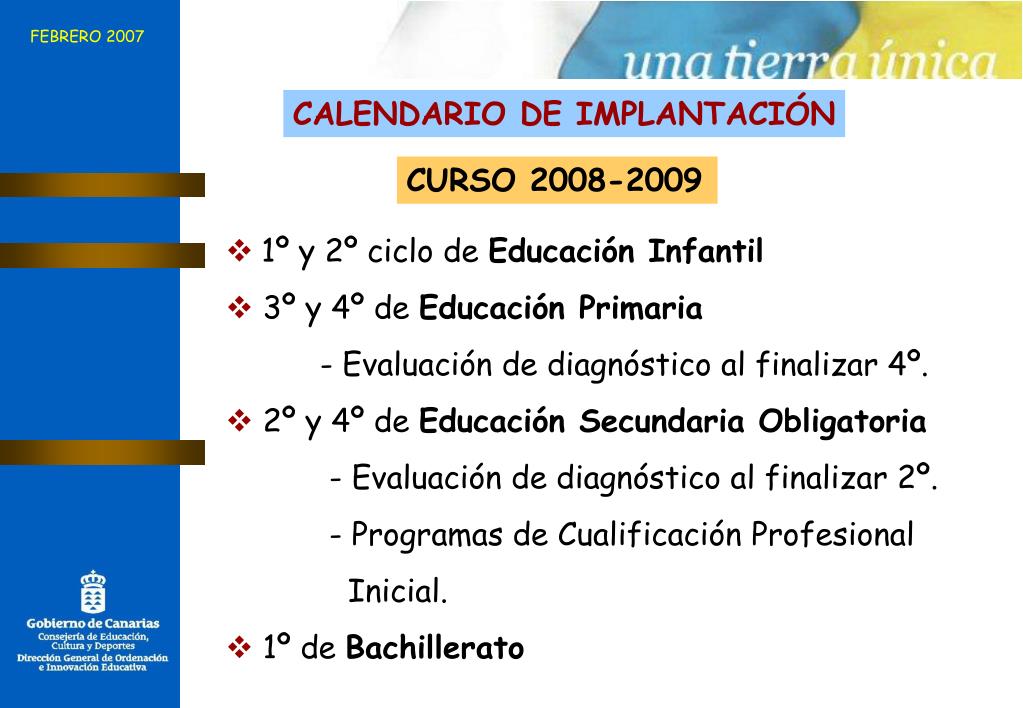 FEBRERO 2007 CALENDARIO DE IMPLANTACIÓN CURSO 2008-2009 • 1º y 2º ciclo de Educación Infantil • 3º y 4º de Educación Primaria - Evaluación de diagnóstico al finalizar 4º. • 2º y 4º de Educación Secundaria Obligatoria - Evaluación de diagnóstico al finalizar 2º. - Programas de Cualificación Profesional Inicial. • 1º de Bachillerato
