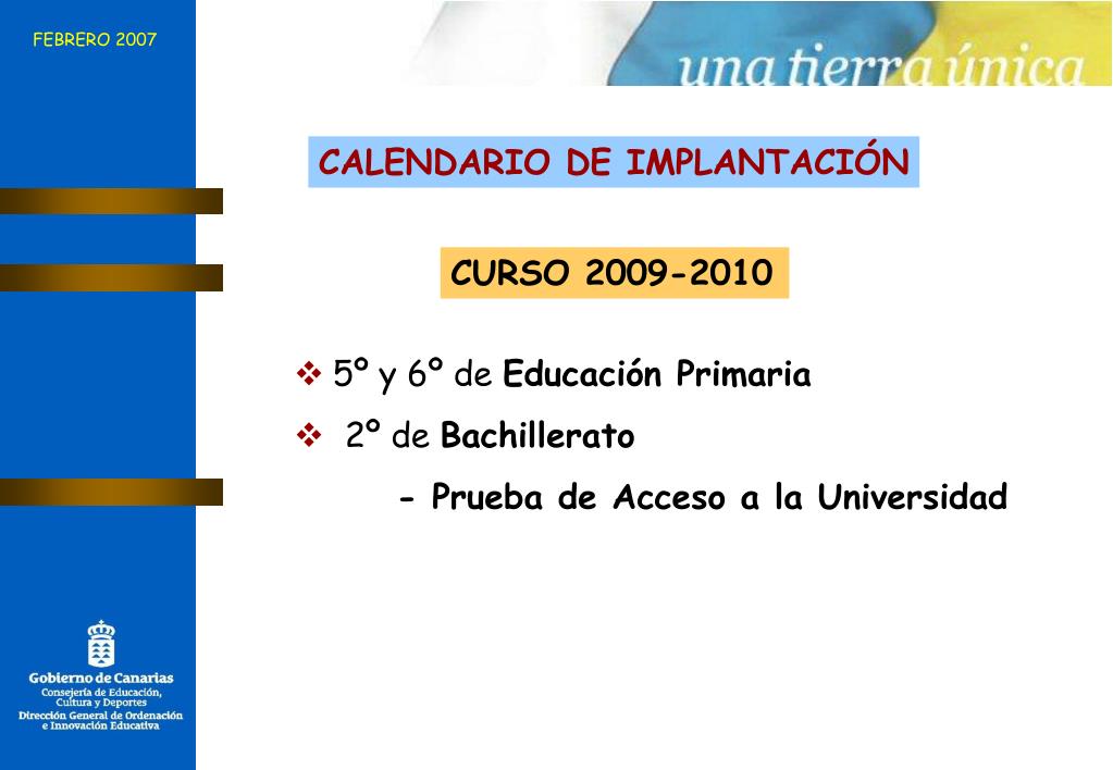 FEBRERO 2007 CALENDARIO DE IMPLANTACIÓN CURSO 2009-2010 • 5º y 6º de Educación Primaria • 2º de Bachillerato - Prueba de Acceso a la Universidad