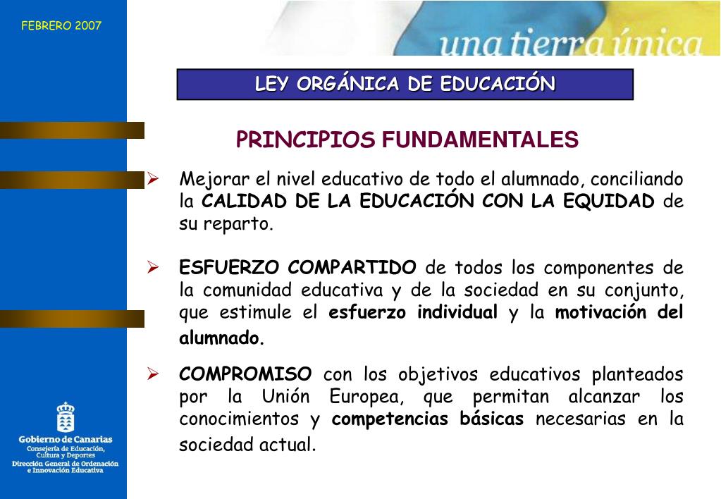 FEBRERO 2007 LEY ORGÁNICA DE EDUCACIÓN PRINCIPIOS FUNDAMENTALES • Mejorar el nivel educativo de todo el alumnado, conciliando la CALIDAD DE LA EDUCACIÓN CON LA EQUIDAD de su reparto. • ESFUERZO COMPARTIDO de todos los componentes de la comunidad educativa y de la sociedad en su conjunto, que estimule el esfuerzo individual y la motivación del alumnado. • COMPROMISO con los objetivos educativos planteados por la Unión Europea, que permitan alcanzar los conocimientos y competencias básicas necesarias en la sociedad actual.
