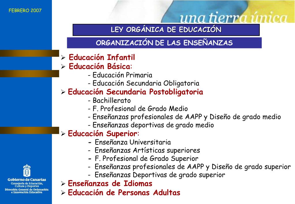 FEBRERO 2007 LEY ORGÁNICA DE EDUCACIÓN ORGANIZACIÓNDE LAS ENSEÑANZAS • Educación Infantil • Educación Básica: - Educación Primaria - Educación Secundaria Obligatoria • Educación Secundaria Postobligatoria - Bachillerato - F. Profesional de Grado Medio - Enseñanzas profesionales de AAPP y Diseño de grado medio - Enseñanzas deportivas degrado medio • Educación Superior: - Enseñanza Universitaria - Enseñanzas Artísticas superiores - F. Profesional de Grado Superior - Enseñanzas profesionales de AAPP y Diseño de grado superior - Enseñanzas Deportivas de grado superior • Enseñanzas de Idiomas • Educación de Personas Adultas