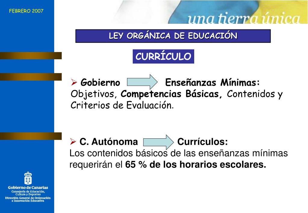 FEBRERO 2007 LEY ORGÁNICA DE EDUCACIÓN CURRÍCULO • Gobierno Enseñanzas Mínimas: Objetivos, Competencias Básicas, Contenidos y Criterios de Evaluación. • C. Autónoma Currículos: Los contenidos básicos de las enseñanzas mínimas requerirán el 65 % de los horarios escolares.