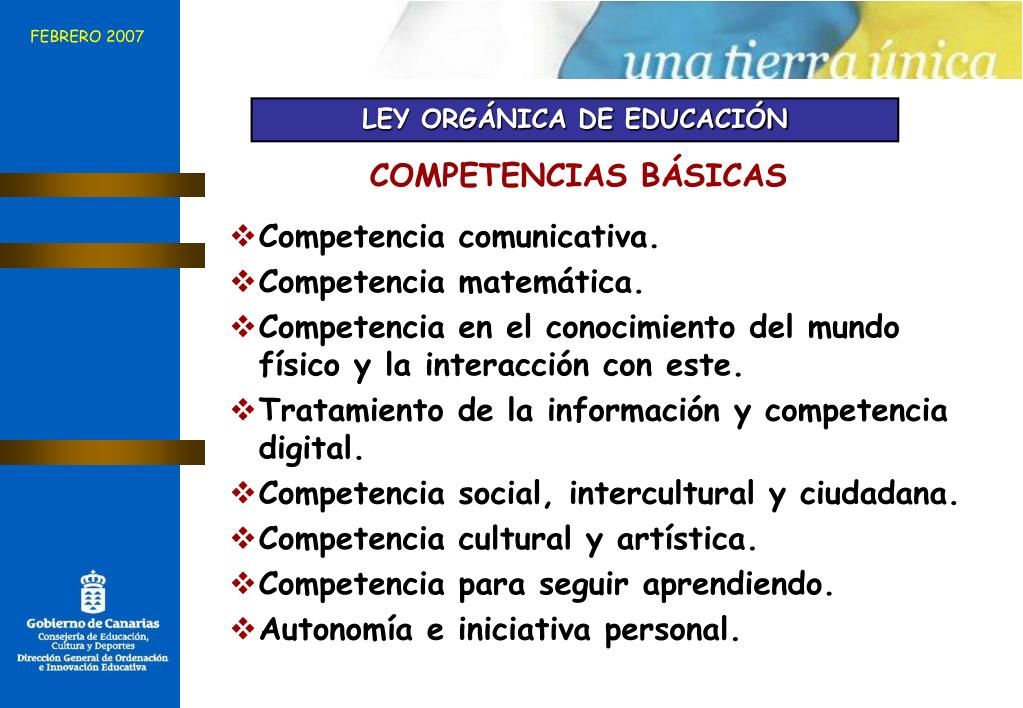 FEBRERO 2007 LEY ORGÁNICA DE EDUCACIÓN COMPETENCIAS BÁSICAS • Competencia comunicativa. • Competencia matemática. • Competencia en el conocimiento del mundo físico y la interacción con este. • Tratamiento de la información y competencia digital. • Competencia social, intercultural y ciudadana. • Competencia cultural y artística. • Competencia para seguir aprendiendo. • Autonomía e iniciativa personal.