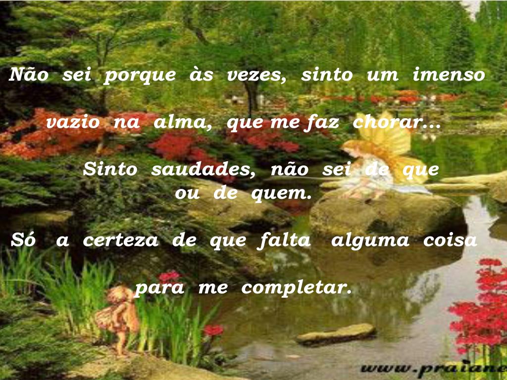 Não sei porque às vezes, sinto um imenso vazio na alma, que me faz chorar... Sinto saudades, não sei de que ou de quem. Só a certeza de que falta alguma coisa para me completar.