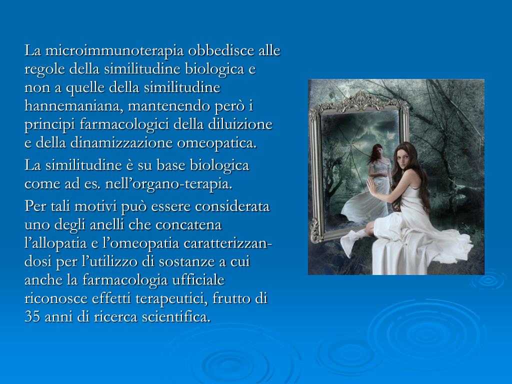 La microimmunoterapia obbedisce alle regole della similitudine biologica e non a quelle della similitudine hannemaniana, mantenendo però i principi farmacologici della diluizione e della dinamizzazione omeopatica. La similitudine è su base biologica come ad es. nell’organo-terapia. Per tali motivi può essere considerata uno degli anelli che concatena l’allopatia e l’omeopatia caratterizzan- dosi per l’utilizzo di sostanze a cui anche la farmacologia ufficiale riconosce effetti terapeutici, frutto di 35 anni di ricerca scientifica.