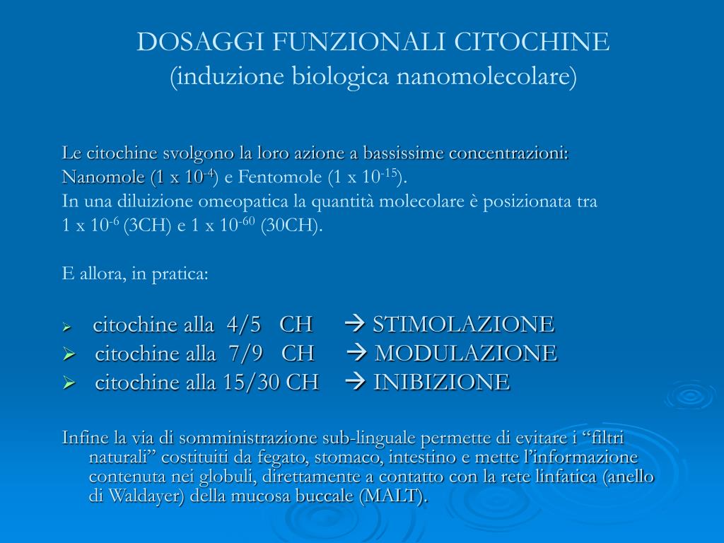 Le citochine svolgono la loro azione a bassissime concentrazioni: Nanomole (1 x 10-4) e Fentomole (1 x 10-15). In una diluizione omeopatica la quantità molecolare è posizionata tra 1 x 10-6 (3CH) e 1 x 10-60 (30CH). E allora, in pratica: citochine alla 4/5 CH STIMOLAZIONE citochine alla 7/9 CH MODULAZIONE citochine alla 15/30 CH INIBIZIONE Infine la via di somministrazione sub-linguale permette di evitare i “filtri naturali” costituiti da fegato, stomaco, intestino e mette l’informazione contenuta nei globuli, direttamente a contatto con la rete linfatica (anello di Waldayer) della mucosa buccale (MALT). DOSAGGI FUNZIONALI CITOCHINE (induzione biologica nanomolecolare)