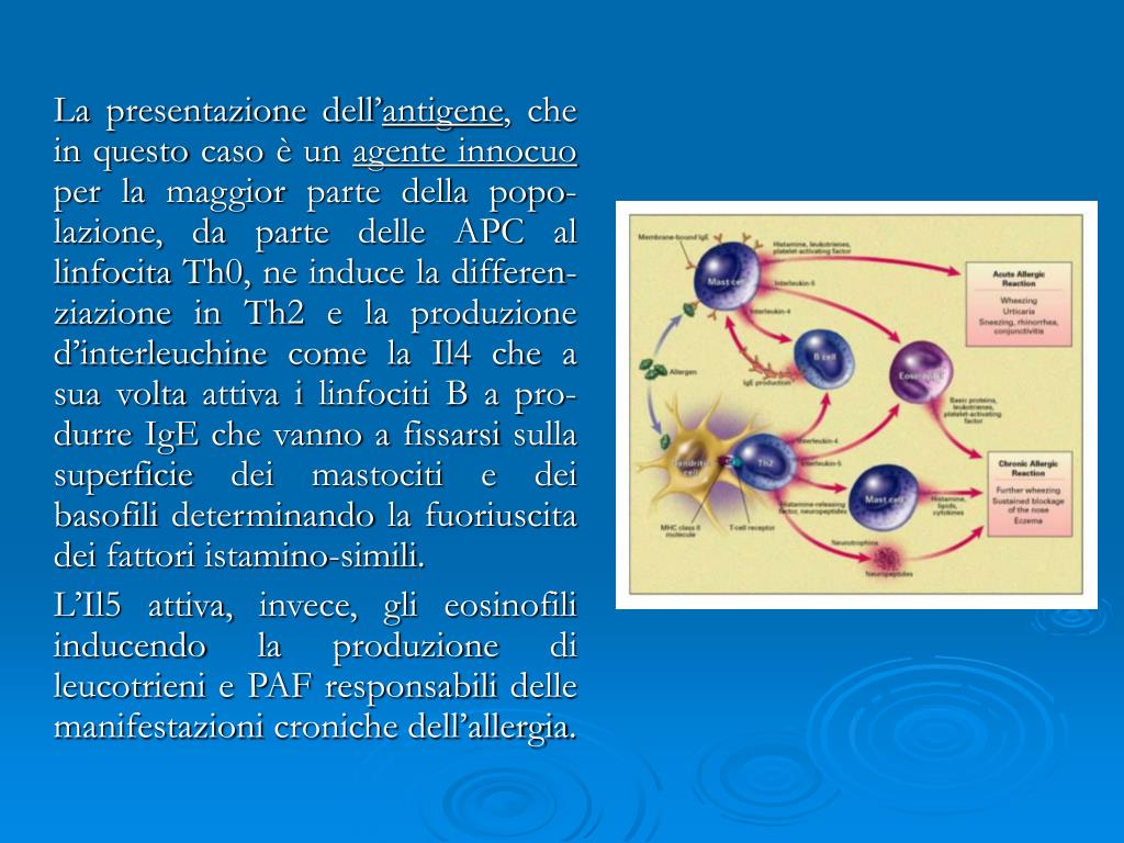La presentazione dell’antigene, che in questo caso è un agente innocuo per la maggior parte della popo-lazione, da parte delle APC al linfocita Th0, ne induce la differen-ziazione in Th2 e la produzione d’interleuchine come la Il4 che a sua volta attiva i linfociti B a pro-durre IgE che vanno a fissarsi sulla superficie dei mastociti e dei basofili determinando la fuoriuscita dei fattori istamino-simili. L’Il5 attiva, invece, gli eosinofili inducendo la produzione di leucotrieni e PAF responsabili delle manifestazioni croniche dell’allergia.