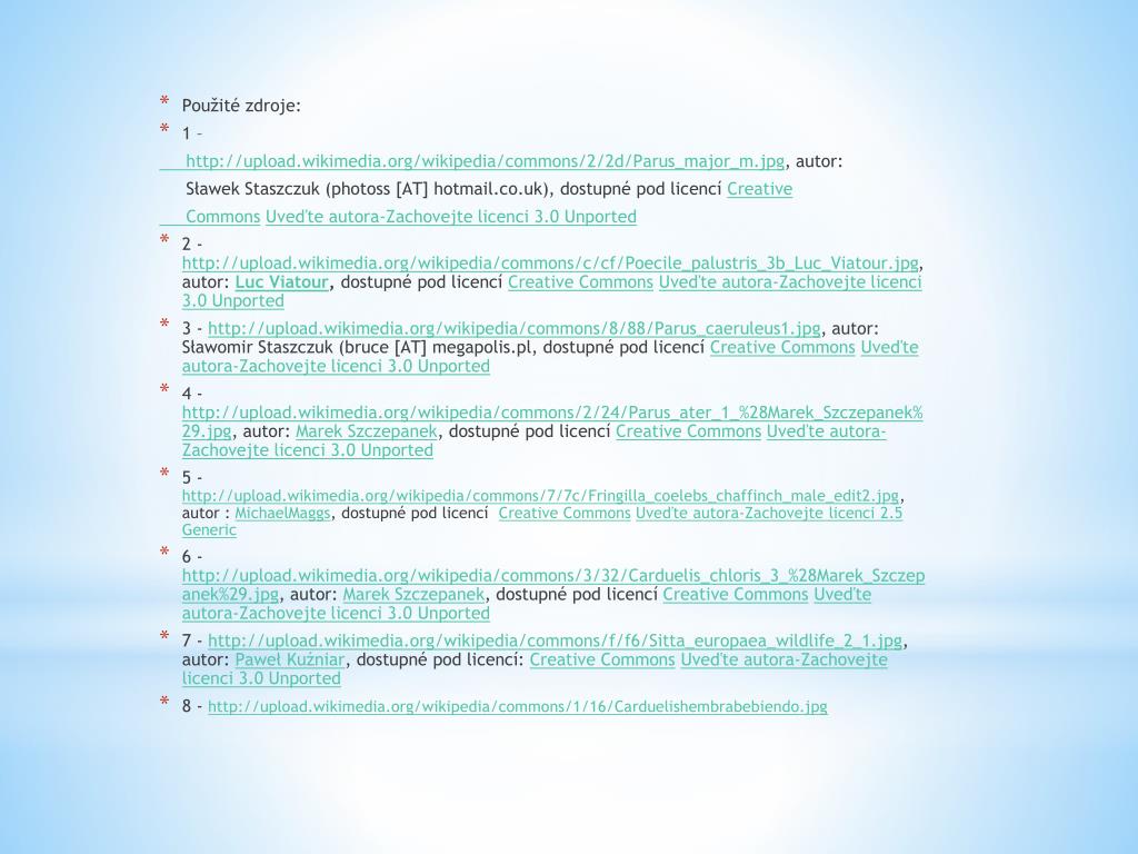 Použité zdroje: • 1 – http://upload.wikimedia.org/wikipedia/commons/2/2d/Parus_major_m.jpg, autor: SławekStaszczuk (photoss [AT] hotmail.co.uk), dostupné pod licencí Creative CommonsUveďte autora-Zachovejte licenci 3.0 Unported • 2 -http://upload.wikimedia.org/wikipedia/commons/c/cf/Poecile_palustris_3b_Luc_Viatour.jpg, autor: LucViatour, dostupné pod licencí CreativeCommonsUveďte autora-Zachovejte licenci 3.0 Unported • 3 - http://upload.wikimedia.org/wikipedia/commons/8/88/Parus_caeruleus1.jpg, autor: SławomirStaszczuk (bruce [AT] megapolis.pl, dostupné pod licencí Creative CommonsUveďteautora-Zachovejtelicenci 3.0 Unported • 4 - http://upload.wikimedia.org/wikipedia/commons/2/24/Parus_ater_1_%28Marek_Szczepanek%29.jpg, autor: Marek Szczepanek, dostupné pod licencí Creative CommonsUveďteautora-Zachovejtelicenci 3.0 Unported • 5 - http://upload.wikimedia.org/wikipedia/commons/7/7c/Fringilla_coelebs_chaffinch_male_edit2.jpg, autor : MichaelMaggs, dostupné pod licencí CreativeCommonsUveďte autora-Zachovejte licenci 2.5 Generic • 6 - http://upload.wikimedia.org/wikipedia/commons/3/32/Carduelis_chloris_3_%28Marek_Szczepanek%29.jpg, autor: Marek Szczepanek, dostupné pod licencí CreativeCommonsUveďte autora-Zachovejte licenci 3.0 Unported • 7 - http://upload.wikimedia.org/wikipedia/commons/f/f6/Sitta_europaea_wildlife_2_1.jpg, autor: PawełKuźniar, dostupné pod licencí: CreativeCommonsUveďte autora-Zachovejte licenci 3.0 Unported • 8 - http://upload.wikimedia.org/wikipedia/commons/1/16/Carduelishembrabebiendo.jpg