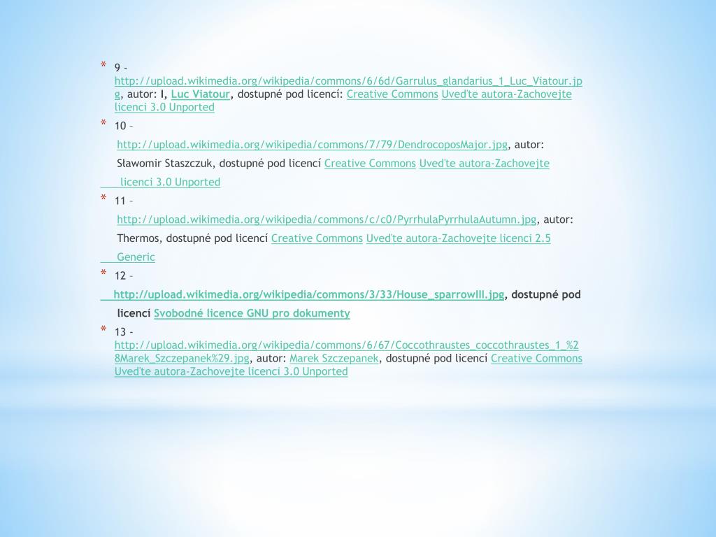 9 - http://upload.wikimedia.org/wikipedia/commons/6/6d/Garrulus_glandarius_1_Luc_Viatour.jpg, autor: I, LucViatour, dostupné pod licencí: CreativeCommonsUveďte autora-Zachovejte licenci 3.0 Unported • 10 – http://upload.wikimedia.org/wikipedia/commons/7/79/DendrocoposMajor.jpg, autor: SławomirStaszczuk, dostupné pod licencí Creative CommonsUveďteautora-Zachovejte licenci3.0 Unported • 11 – http://upload.wikimedia.org/wikipedia/commons/c/c0/PyrrhulaPyrrhulaAutumn.jpg, autor: Thermos, dostupné pod licencí CreativeCommonsUveďte autora-Zachovejte licenci 2.5 Generic • 12 – http://upload.wikimedia.org/wikipedia/commons/3/33/House_sparrowIII.jpg, dostupné pod licencí Svobodné licence GNU pro dokumenty • 13 - http://upload.wikimedia.org/wikipedia/commons/6/67/Coccothraustes_coccothraustes_1_%28Marek_Szczepanek%29.jpg, autor: Marek Szczepanek, dostupné pod licencí Creative CommonsUveďteautora-Zachovejtelicenci 3.0 Unported