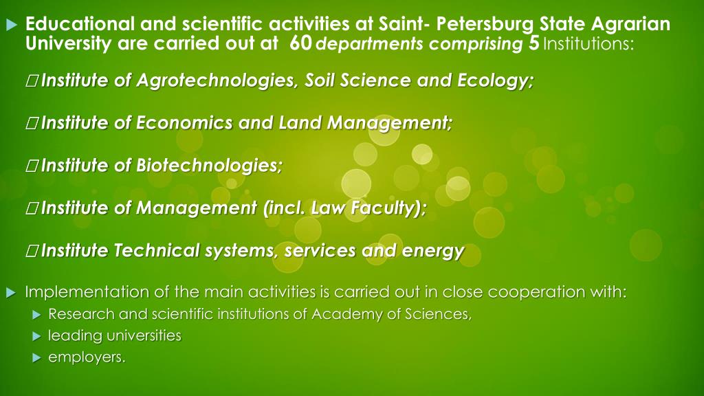 EducationalandscientificactivitiesatSaint- PetersburgStateAgrarianUniversityarecarriedoutat60departmentscomprising5Institutions: InstituteofAgrotechnologies, SoilScienceandEcology; InstituteofEconomicsandLandManagement; InstituteofBiotechnologies; InstituteofManagement (incl. Law Faculty); InstituteTechnicalsystems, servicesandenergy • Implementationofthemainactivitiesiscarriedoutinclosecooperationwith: • Research and scientificinstitutionsofAcademyofSciences, • leadinguniversities • employers.