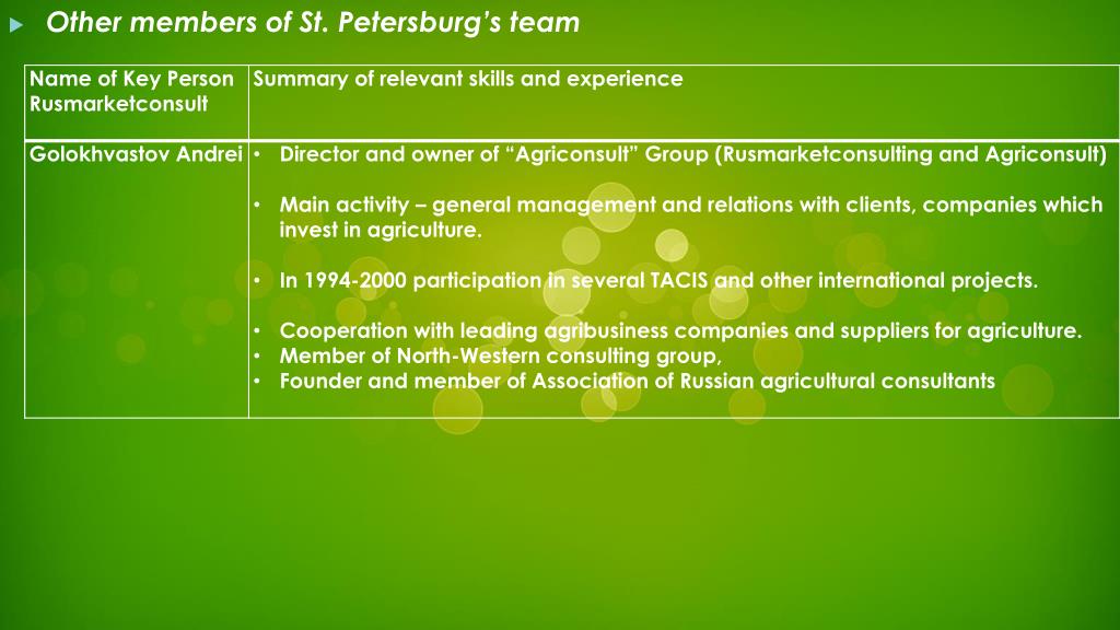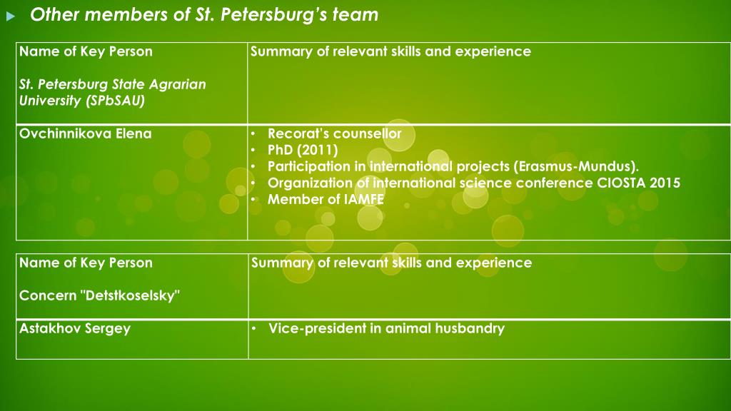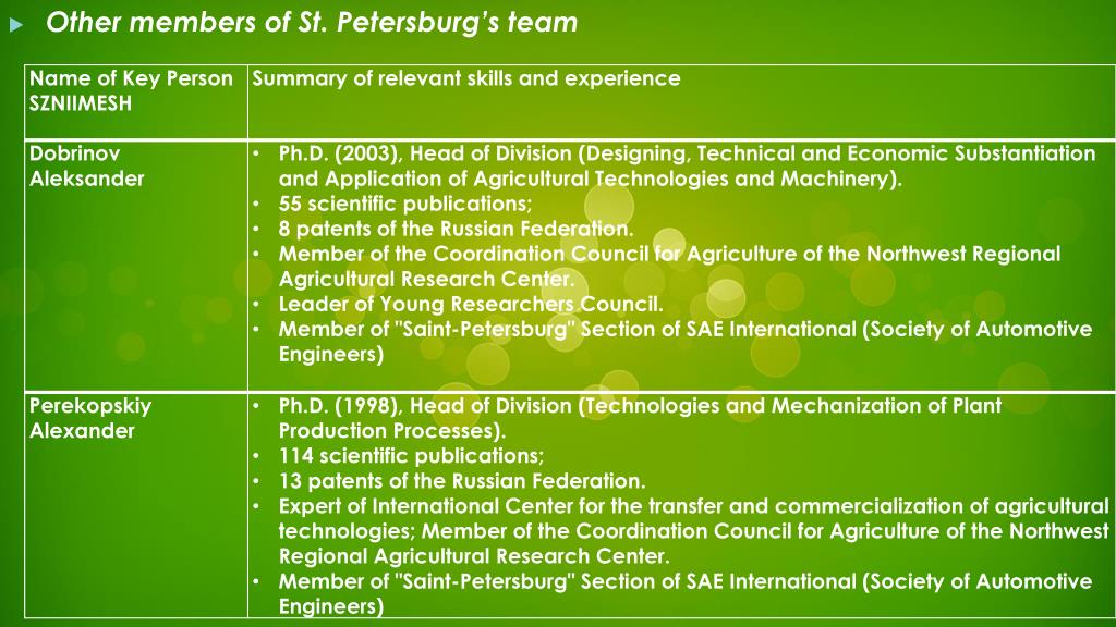 Project Manager, St. Petersburg State Agrarian University:Smelik Victor Aleksandrovich, Doctor of Technical Sciences, Professor, Vice-Rector on Science . • Expert in educational activities since 1996. • Annually participates in the work of commissions for state and public accreditation of educational programs in higher educational institutions of Russia • As the head of the expert group (chairman, chairman deputy of the commission), educational programs expert participates in expert committees work. • 14 different examinations of educational programs of higher and vocational education were conducted in 2013. • Regularly takes an active part in meetings and workshops of the Ministry of Education and Science of the Russian Federation on the problems of specialists’ quality training improvement. • Is a member of the Advisory Council of the Higher Attestation Commission. • Hassuccessfulmanagementexperienceinleadingscientificandtechnicalprojects.