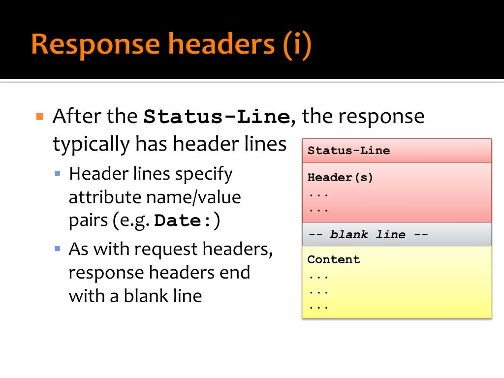 Response headers (i) • After the Status-Line, the response typically has header lines • Header lines specifyattribute name/valuepairs (e.g. Date:) • As with request headers,response headers endwith a blank line Status-Line Header(s) ... ... -- blank line -- Content ... ... ...