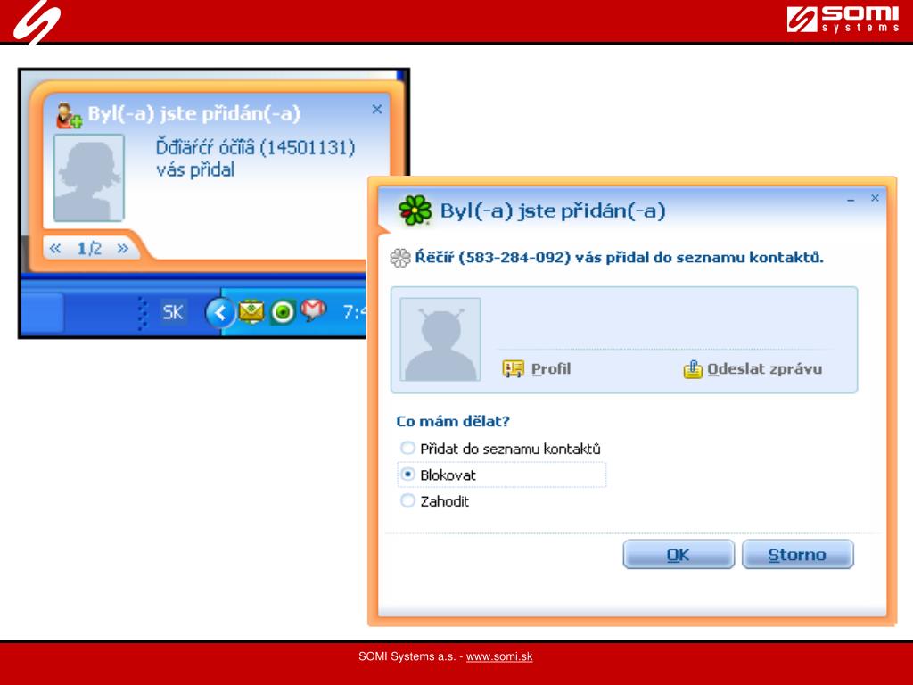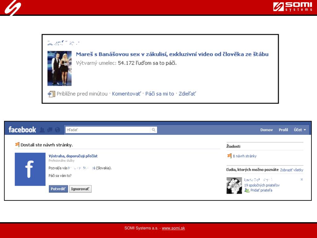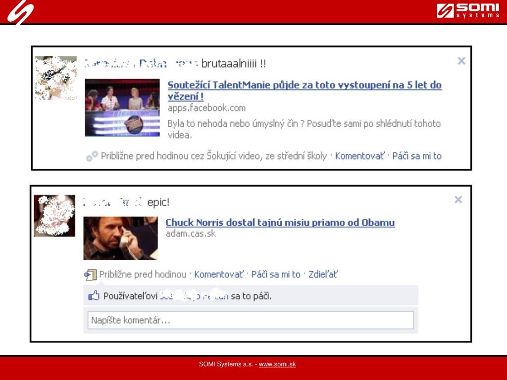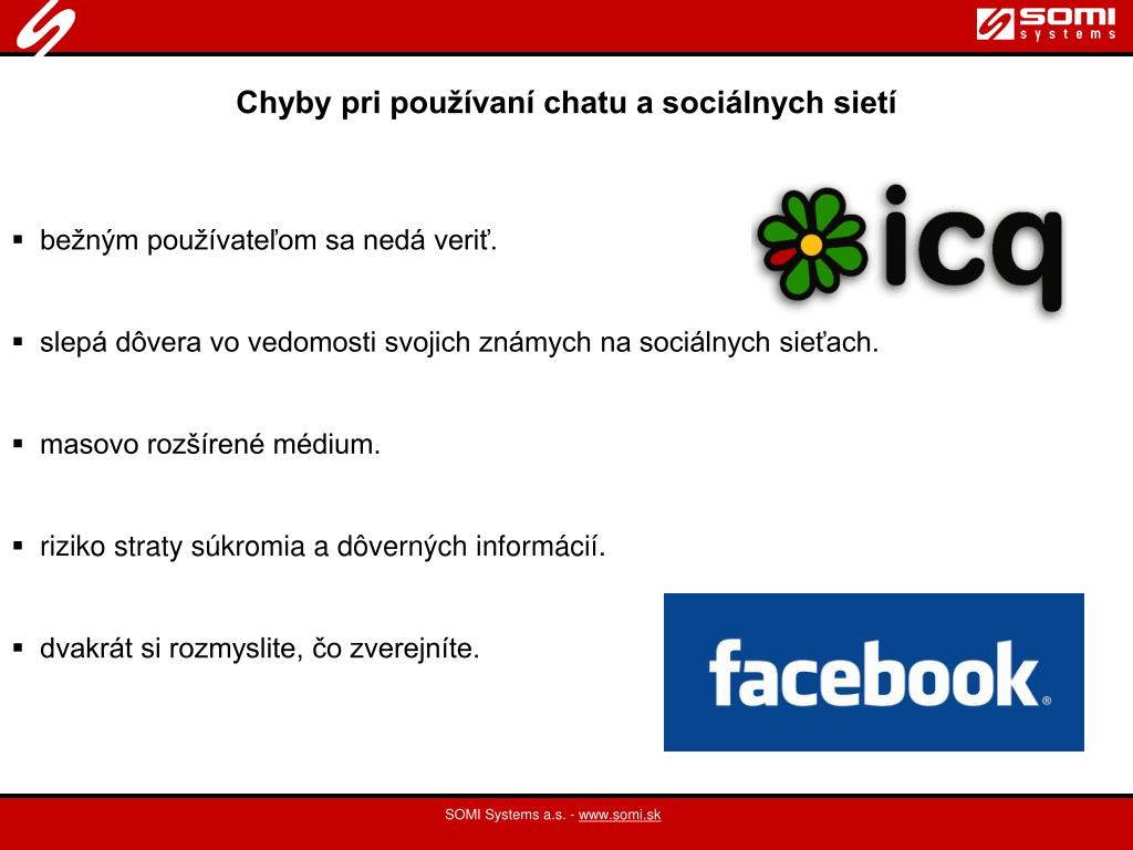 Chyby pri používaní chatu a sociálnych sietí • bežným používateľom sa nedá veriť. • slepá dôvera vo vedomosti svojich známych na sociálnych sieťach. • masovo rozšírené médium. • riziko straty súkromia a dôverných informácií. • dvakrát si rozmyslite, čo zverejníte. SOMI Systems a.s. - www.somi.sk