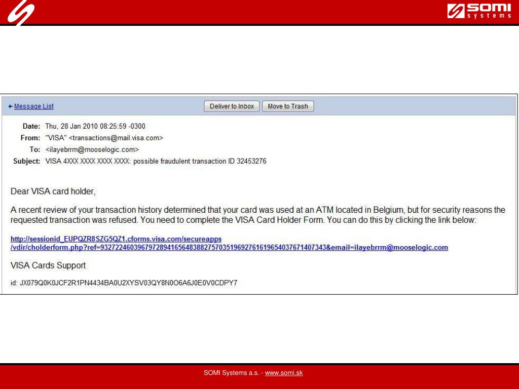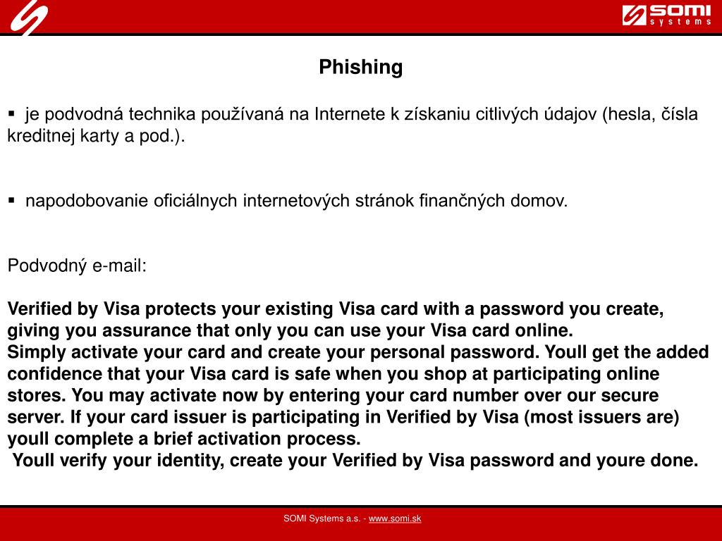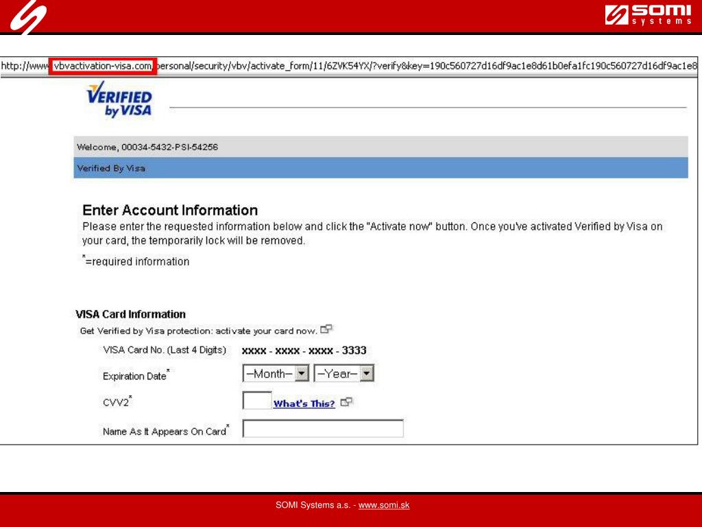 Phishing • je podvodná technika používaná na Internete k získaniu citlivých údajov (hesla, čísla kreditnej karty a pod.). • napodobovanie oficiálnych internetových stránok finančných domov. • Podvodný e-mail: • Verified by Visa protects your existing Visa card with a password you create, giving you assurance that only you can use your Visa card online. • Simply activate your card and create your personal password. Youll get the added confidence that your Visa card is safe when you shop at participating online stores. You may activate now by entering your card number over our secure server. If your card issuer is participating in Verified by Visa (most issuers are) youll complete a brief activation process. • Youll verify your identity, create your Verified by Visa password and youre done. SOMI Systems a.s. - www.somi.sk