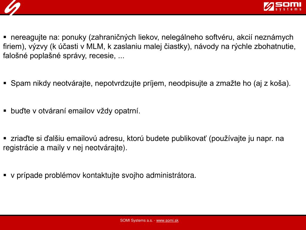 nereagujte na: ponuky (zahraničných liekov, nelegálneho softvéru, akcií neznámych firiem), výzvy (k účasti v MLM, k zaslaniu malej čiastky), návody na rýchle zbohatnutie, falošné poplašné správy, recesie, ... • Spam nikdy neotvárajte, nepotvrdzujte príjem, neodpisujte a zmažte ho (aj z koša). • buďte v otváraní emailov vždy opatrní. • zriaďte si ďalšiu emailovú adresu, ktorú budete publikovať (používajte ju napr. na registrácie a maily v nej neotvárajte). • v prípade problémov kontaktujte svojho administrátora. SOMI Systems a.s. - www.somi.sk
