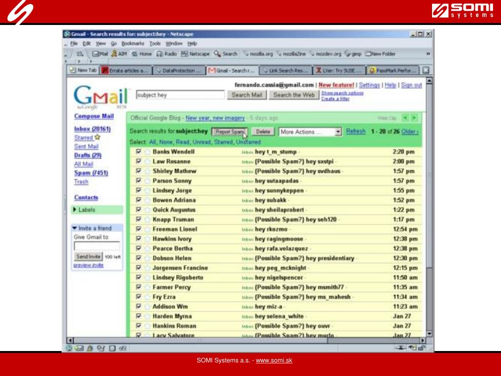 dnes až 96% mailovej komunikácie je považovanej za Spam. • používanie rôznych adries pre rôzne účely. • používanie moderných mail klientov, ktorí napr. neumožňujú sťahovanie obrázkov • z externých zdrojov. • naučiť sa rozoznávať Spam. SOMI Systems a.s. - www.somi.sk