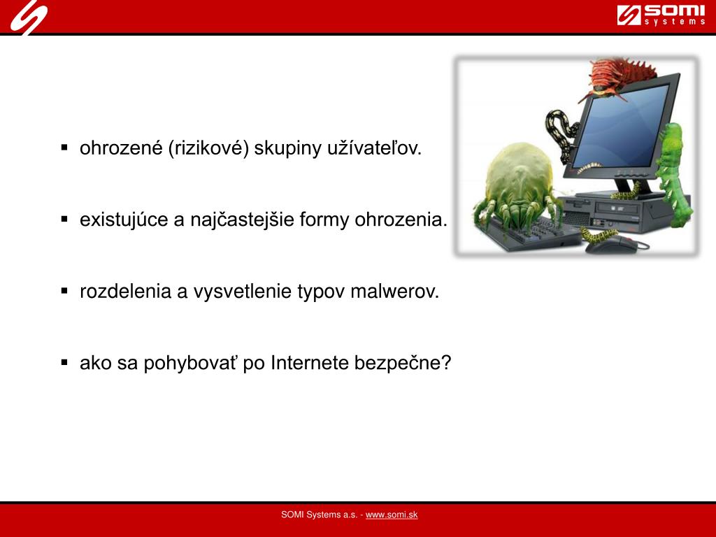 Internetová a počítačová bezpečnosť. SOMI Systems a.s. - www.somi.sk. ohrozené (rizikové) skupiny užívateľov. existujúce a najčastejšie formy ohrozenia. rozdelenia a vysvetlenie typov malwerov. ako sa pohybovať po Internete bezpečne?. SOMI Systems a.s. - www.somi.sk.