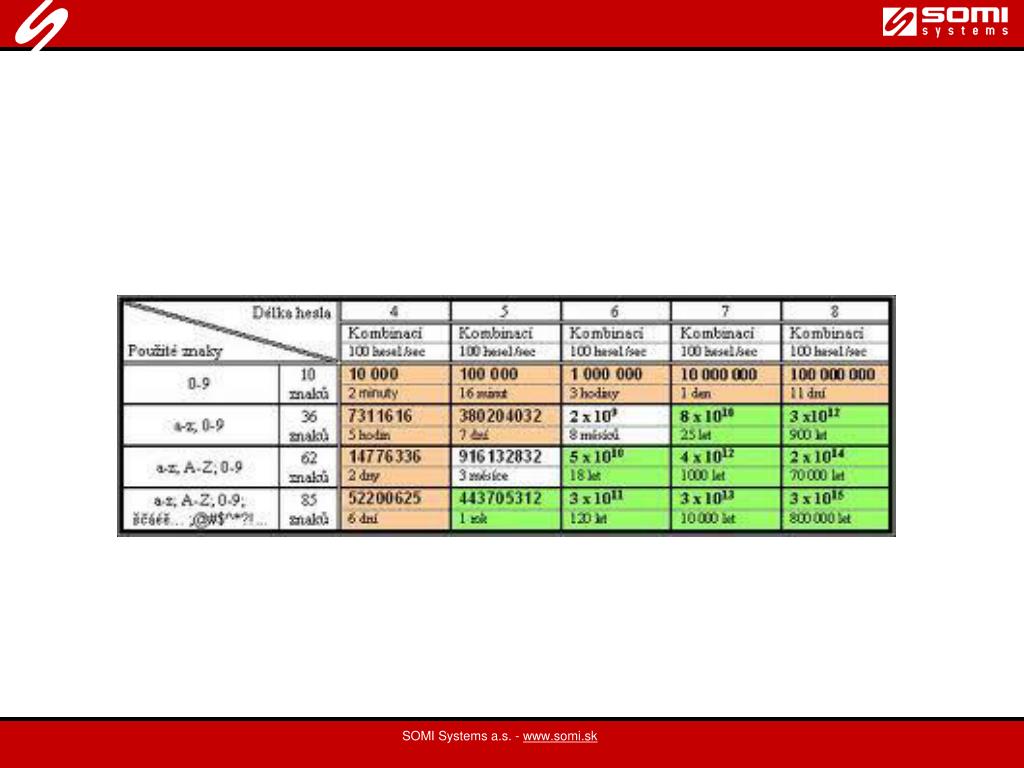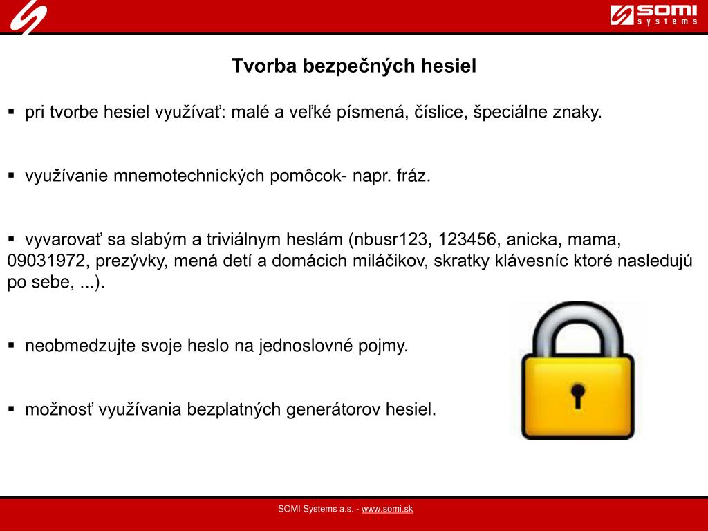 Tvorba bezpečných hesiel • pri tvorbe hesiel využívať: malé a veľké písmená, číslice, špeciálne znaky. • využívanie mnemotechnických pomôcok- napr. fráz. • vyvarovať sa slabým a triviálnym heslám (nbusr123, 123456, anicka, mama, 09031972, prezývky, mená detí a domácich miláčikov, skratky klávesníc ktoré nasledujú po sebe, ...). • neobmedzujte svoje heslo na jednoslovné pojmy. • možnosť využívania bezplatných generátorov hesiel. SOMI Systems a.s. - www.somi.sk