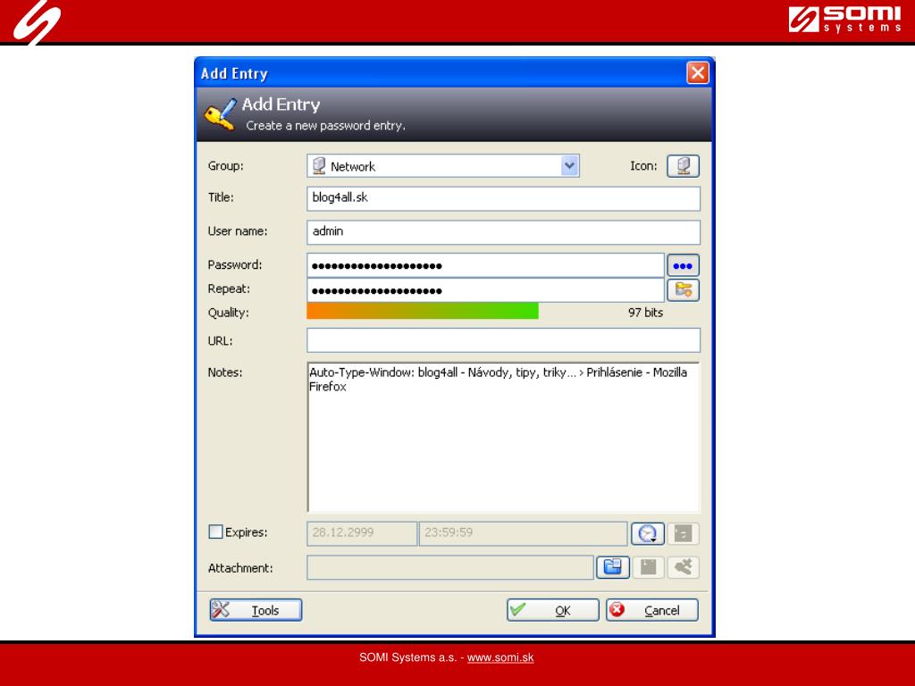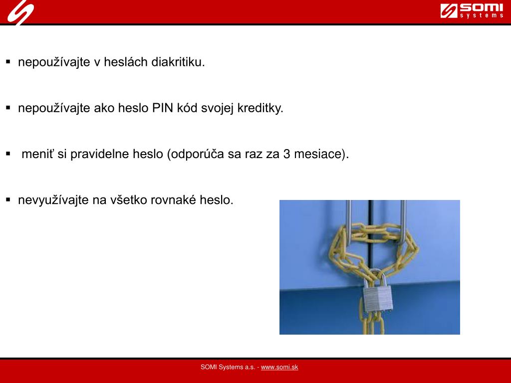 nepoužívajte v heslách diakritiku. • nepoužívajte ako heslo PIN kód svojej kreditky. • meniť si pravidelne heslo (odporúča sa raz za 3 mesiace). • nevyužívajte na všetko rovnaké heslo. SOMI Systems a.s. - www.somi.sk