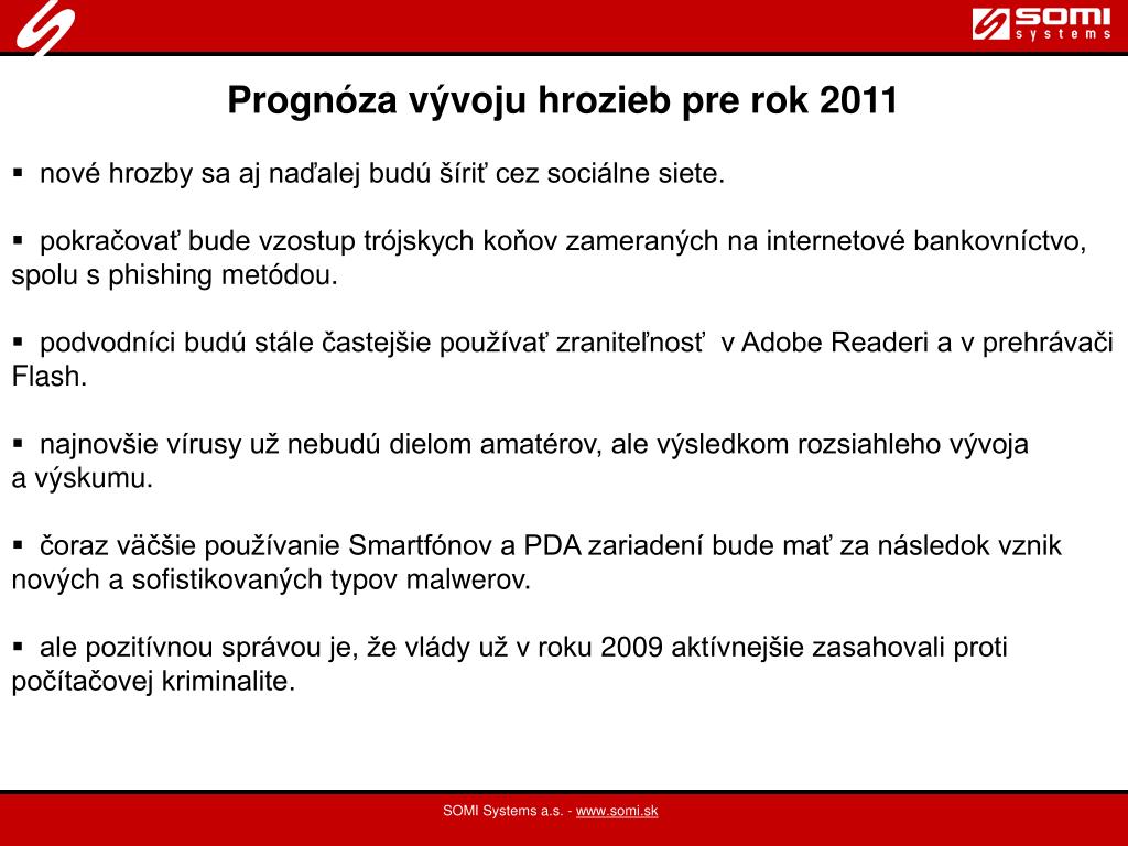Prognóza vývoju hrozieb pre rok 2011 • nové hrozby sa aj naďalej budú šíriť cez sociálne siete. • pokračovať bude vzostup trójskych koňov zameraných na internetové bankovníctvo, spolu s phishing metódou. • podvodníci budú stále častejšie používať zraniteľnosť v Adobe Readeri a v prehrávači Flash. • najnovšie vírusy už nebudú dielom amatérov, ale výsledkom rozsiahleho vývoja • a výskumu. • čoraz väčšie používanie Smartfónov a PDA zariadení bude mať za následok vznik nových a sofistikovaných typov malwerov. • ale pozitívnou správou je, že vlády už v roku 2009 aktívnejšie zasahovali proti počítačovej kriminalite. SOMI Systems a.s. - www.somi.sk