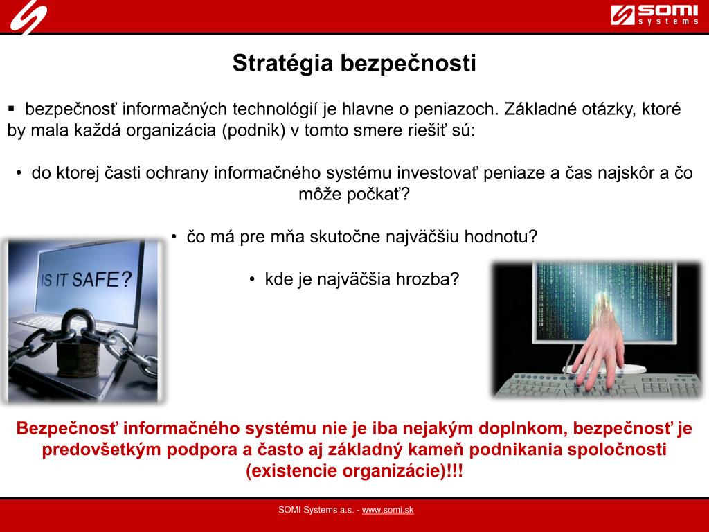 Stratégia bezpečnosti • bezpečnosť informačných technológií je hlavne o peniazoch. Základné otázky, ktoré by mala každá organizácia (podnik) v tomto smere riešiť sú: • do ktorej časti ochrany informačného systému investovať peniaze a čas najskôr a čo môže počkať? • čo má pre mňa skutočne najväčšiu hodnotu? • kde je najväčšia hrozba? • Bezpečnosť informačného systému nie je iba nejakým doplnkom, bezpečnosť je predovšetkým podpora a často aj základný kameň podnikania spoločnosti (existencie organizácie)!!! SOMI Systems a.s. - www.somi.sk