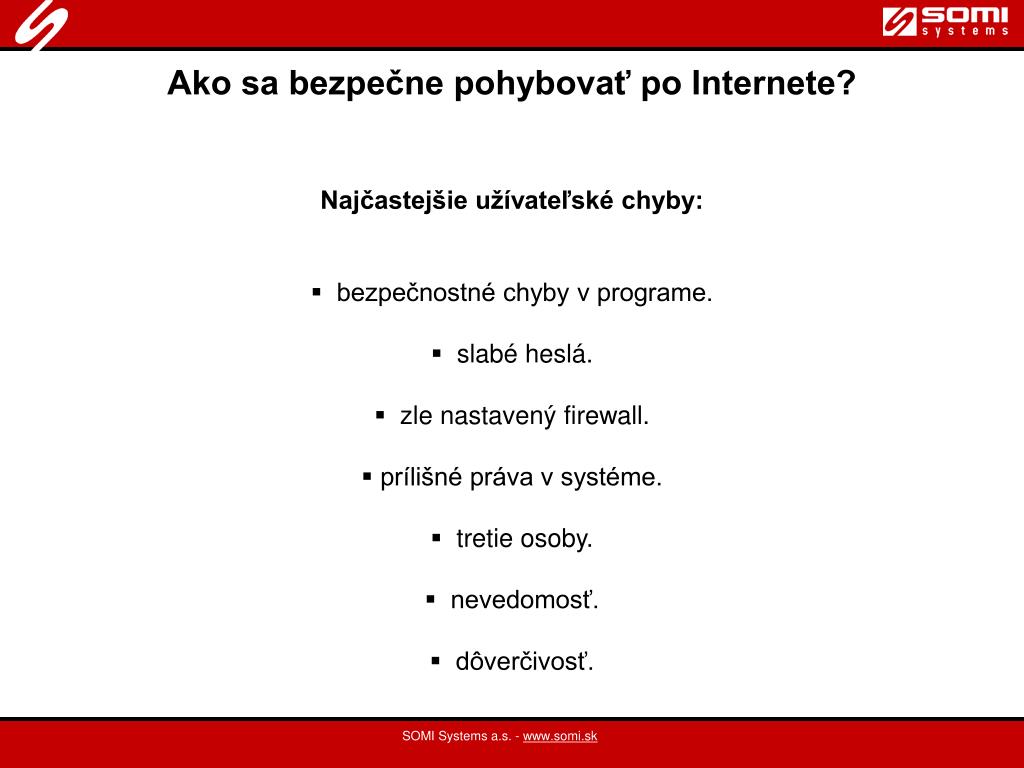 Ako sa bezpečne pohybovať po Internete? • Najčastejšie užívateľské chyby: • bezpečnostné chyby v programe. • slabé heslá. • zle nastavený firewall. • prílišné práva v systéme. • tretie osoby. • nevedomosť. • dôverčivosť. SOMI Systems a.s. - www.somi.sk