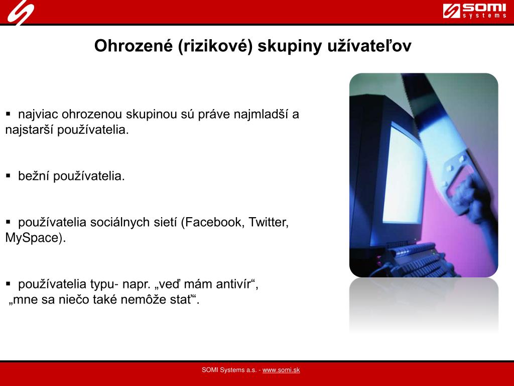 Ohrozené (rizikové) skupiny užívateľov • najviac ohrozenou skupinou sú práve najmladší a najstarší používatelia. • bežní používatelia. • používatelia sociálnych sietí (Facebook, Twitter, MySpace). • používatelia typu- napr. „veď mám antivír“, • „mne sa niečo také nemôže stať“. SOMI Systems a.s. - www.somi.sk