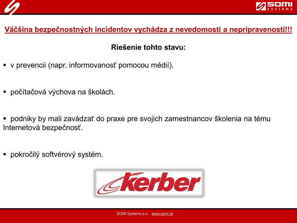 Väčšina bezpečnostných incidentov vychádza z nevedomosti a nepripravenosti!!! • Riešenie tohto stavu: • v prevencii (napr. informovanosť pomocou médií). • počítačová výchova na školách. • podniky by mali zavádzať do praxe pre svojich zamestnancov školenia na tému Internetová bezpečnosť. • pokročilý softvérový systém. SOMI Systems a.s. - www.somi.sk