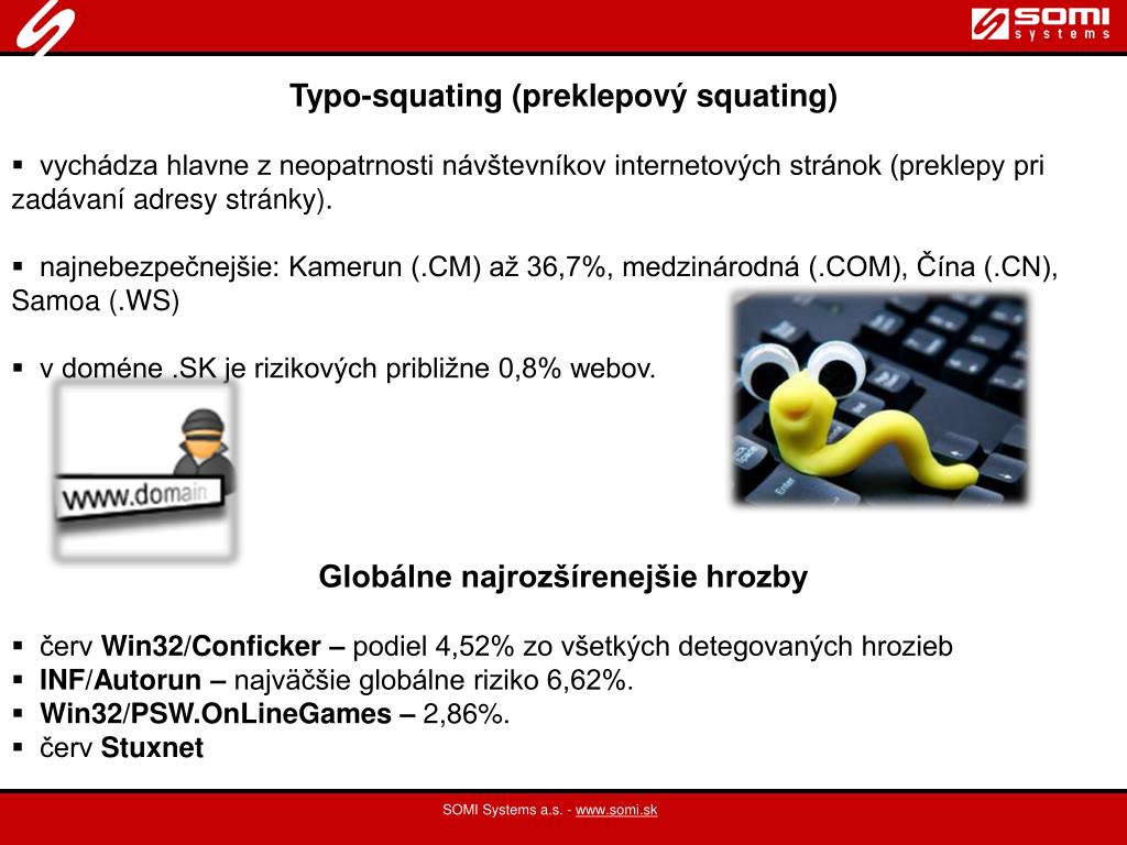 Typo-squating (preklepový squating) • vychádza hlavne z neopatrnosti návštevníkov internetových stránok (preklepy pri zadávaní adresy stránky). • najnebezpečnejšie: Kamerun (.CM) až 36,7%, medzinárodná (.COM), Čína (.CN), Samoa (.WS) • v doméne .SK je rizikových približne 0,8% webov. • Globálne najrozšírenejšie hrozby • červ Win32/Conficker – podiel 4,52% zo všetkých detegovaných hrozieb • INF/Autorun – najväčšie globálne riziko 6,62%. • Win32/PSW.OnLineGames – 2,86%. • červ Stuxnet SOMI Systems a.s. - www.somi.sk