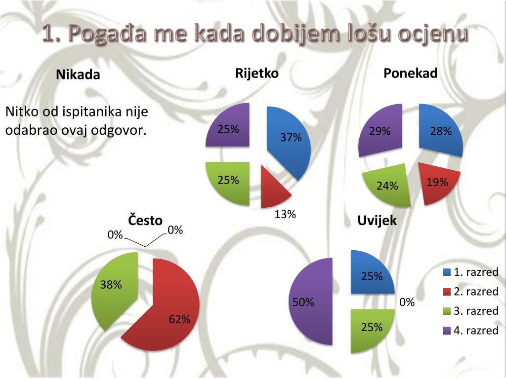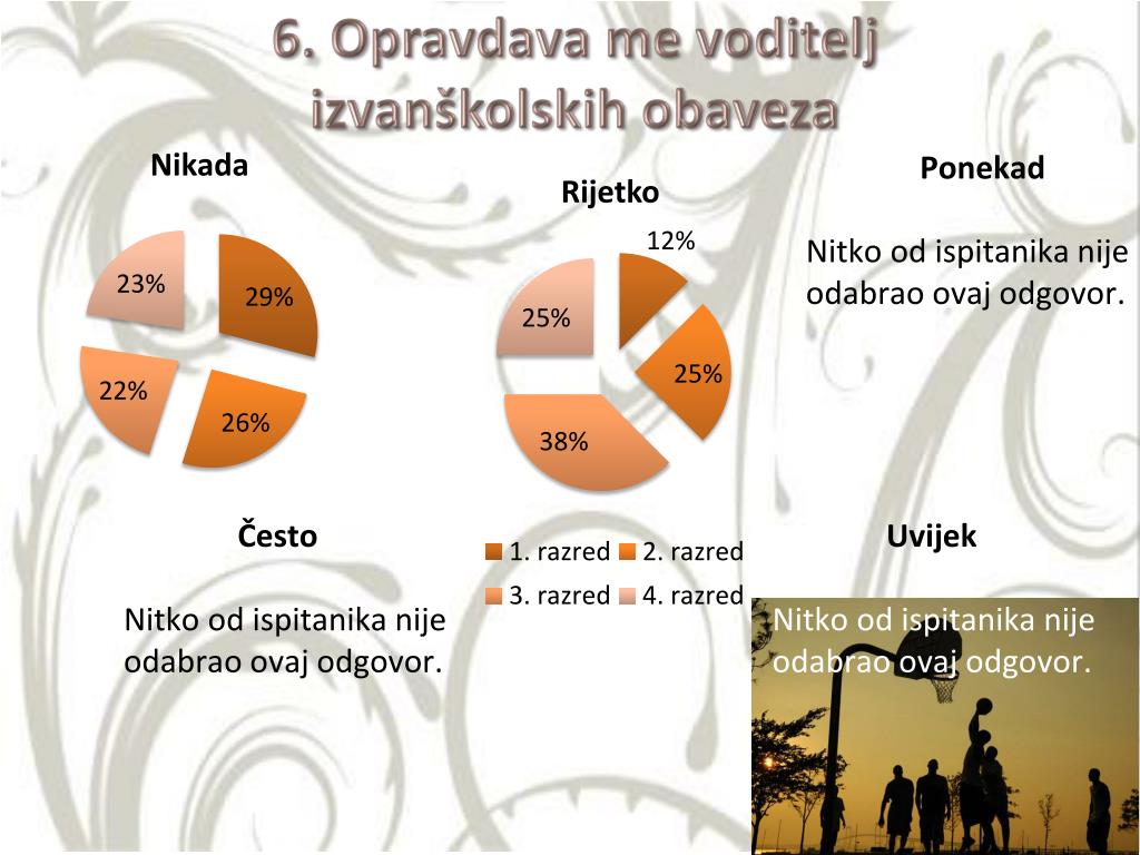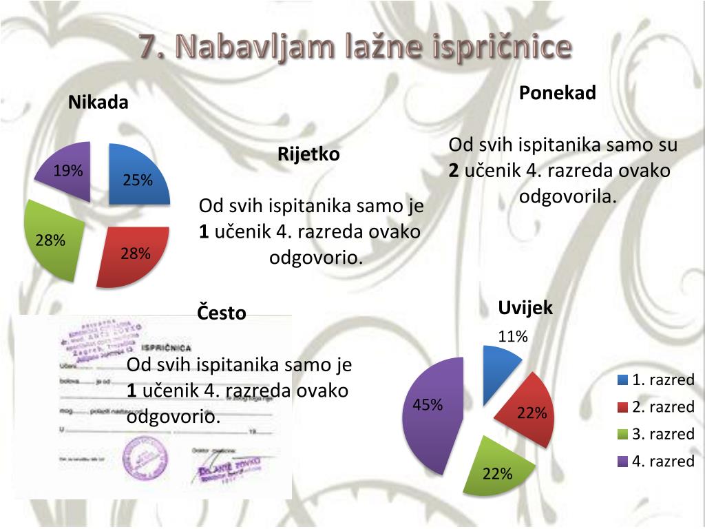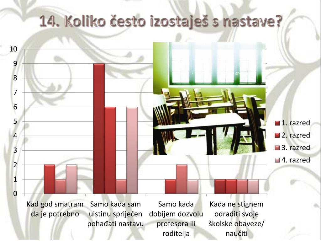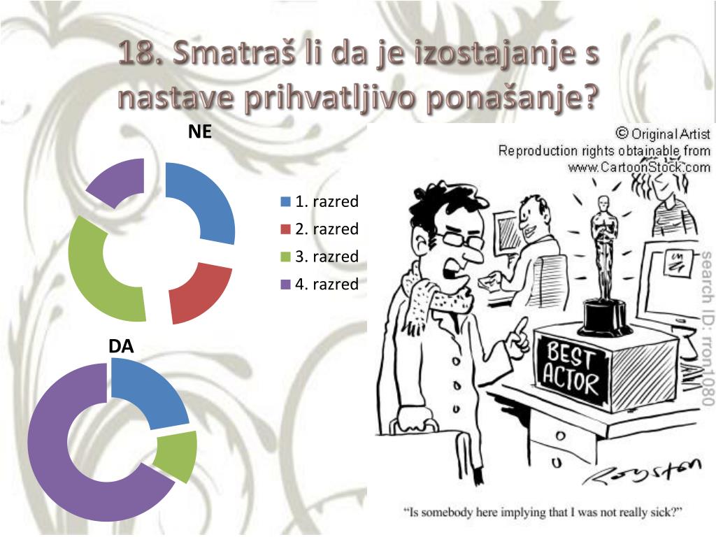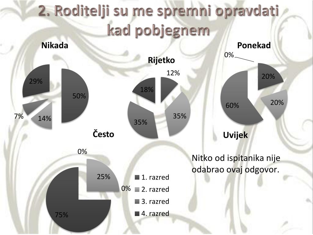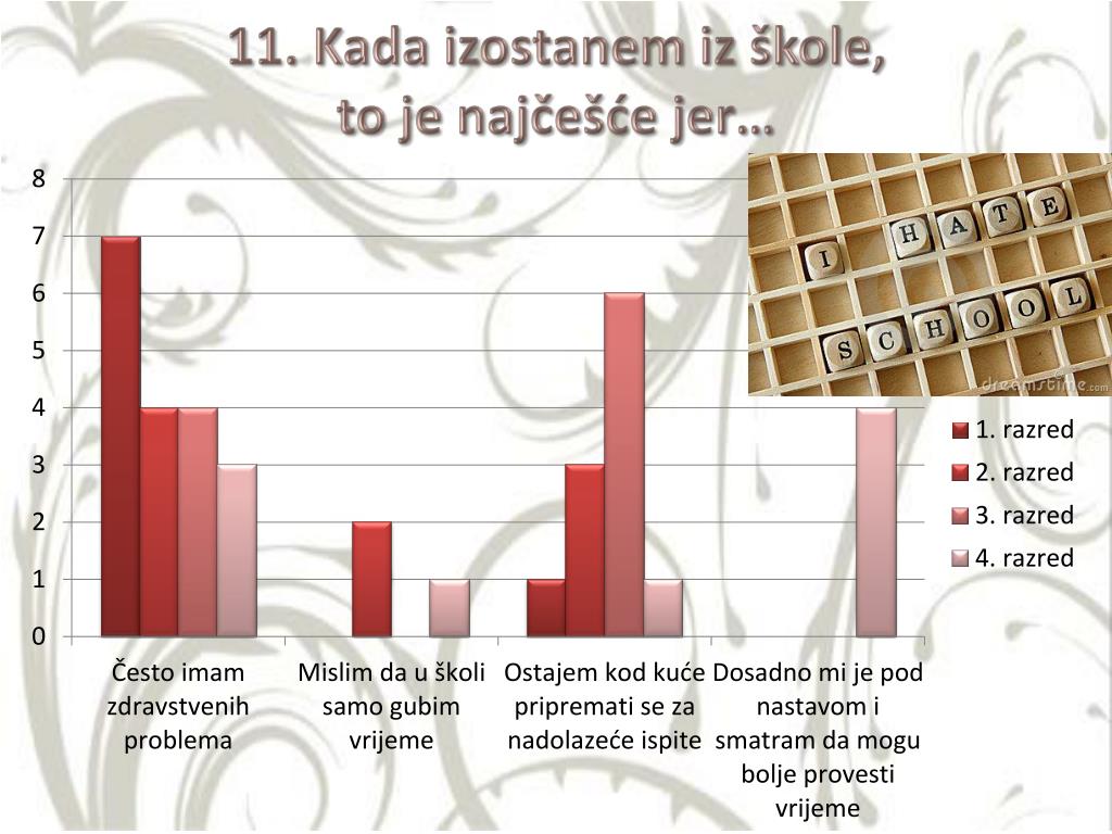 20. Što želiš postići izbjegavanjem nastave? Najopširniji i najzanimljiviji odgovor od svih ispitanika: „Odmor od iscrpljenosti nastale prečestim pohađanjem umno uništavajuće i veoma stresne nastave. Osmosatno sjedenje za školskom klupom uzrokuje teška oštećenja diskusa među kralježnjacima te potiče rapidno nakupljanje masnih naslaga što može uzrokovati srčano zatajenje i moždani udar u kasnoj dobi. Iz prethodno navedenih razloga zaključujemo da je pohađanje škole veoma nezdravo, opasno i samouništavajuće gledano sa psiho-fizičkog stajališta te zbog toga preporučujemo nadležnim organima da reduciraju ukupan broj školskih sati te da prohibiraju jedan radni dan. Ako, u kojem slučaju do toga ne dođe, svim učenicima predlažemo da samoiniciraju opći štrajk školskog sustava.” S poštovanjem, učenik trećeg razreda