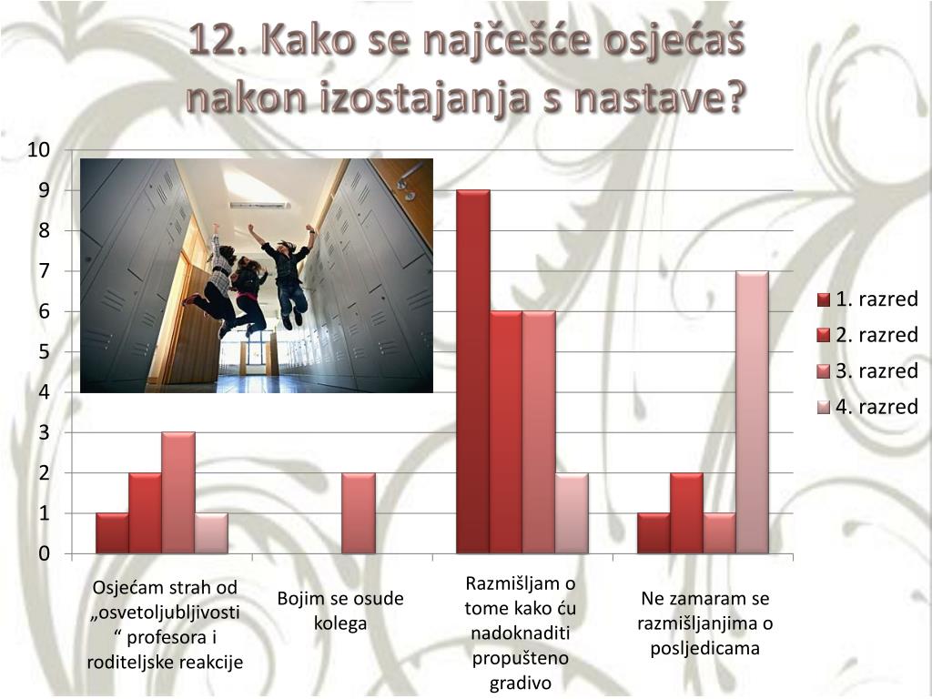 12. Kako se najčešće osjećaš nakon izostajanja s nastave? Razmišljam o tome kako ću nadoknaditi propušteno gradivo Osjećam strah od „osvetoljubljivosti“ profesora i roditeljske reakcije Bojim se osude kolega Ne zamaram se razmišljanjima o posljedicama