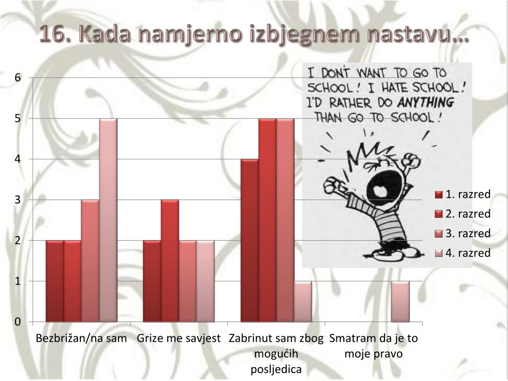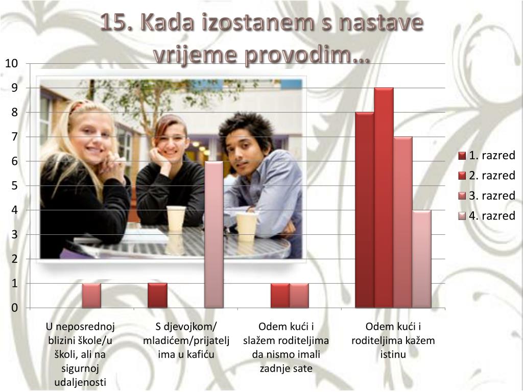 15. Kada izostanem s nastave vrijeme provodim… Uneposrednoj blizini škole/u školi, ali na sigurnoj udaljenosti Sdjevojkom/ mladićem/prijateljima u kafiću Odem kući i slažem roditeljima da nismo imali zadnje sate Odem kući i roditeljima kažem istinu