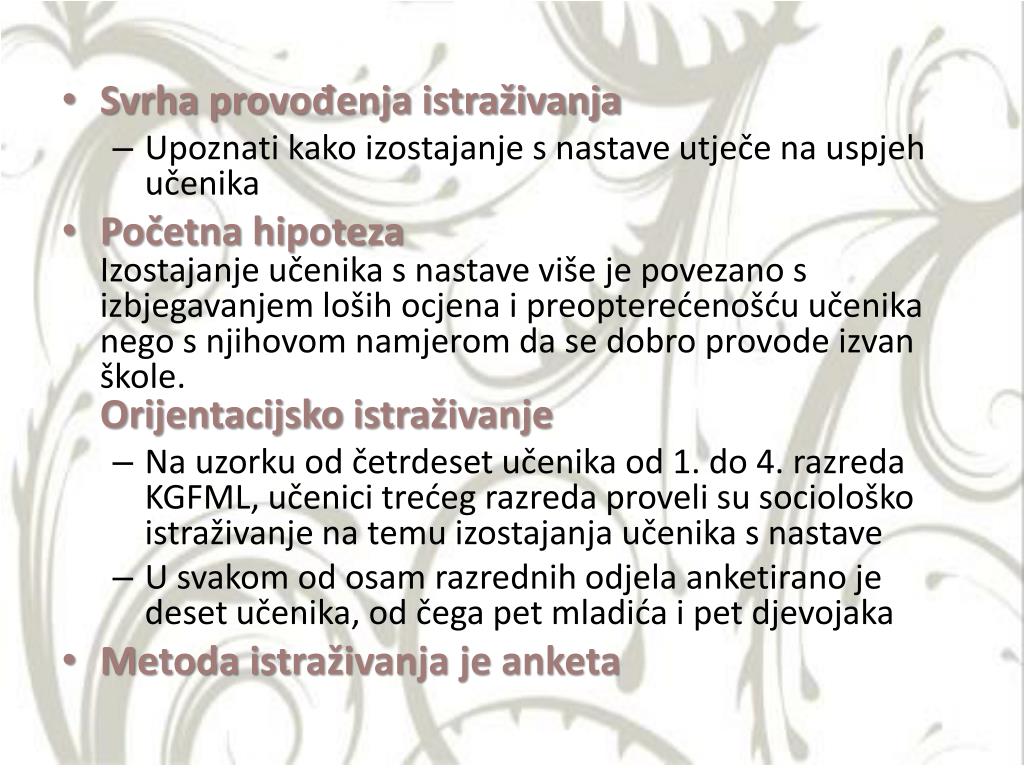 Svrha provođenja istraživanja • Upoznati kako izostajanje s nastave utječe na uspjeh učenika • Početna hipotezaIzostajanje učenika s nastave više je povezano s izbjegavanjem loših ocjena i preopterećenošću učenika nego s njihovom namjerom da se dobro provode izvan škole.Orijentacijsko istraživanje • Na uzorku od četrdeset učenika od 1. do 4. razreda KGFML, učenici trećeg razreda proveli su sociološko istraživanje na temu izostajanja učenika s nastave • U svakom od osam razrednih odjela anketirano je deset učenika, od čega pet mladića i pet djevojaka • Metoda istraživanja je anketa