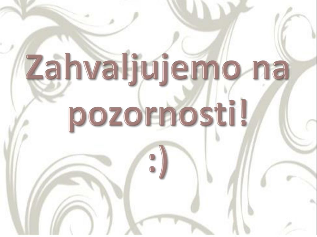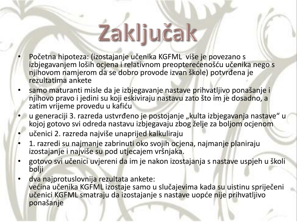 Zaključak • Početna hipoteza: (izostajanje učenika KGFML više je povezano s izbjegavanjem loših ocjena i relativnom preopterećenošću učenika nego s njihovom namjerom da se dobro provode izvan škole) potvrđena je rezultatima ankete • samo maturanti misle da je izbjegavanje nastave prihvatljivo ponašanje i njihovo pravo i jedini su koji eskiviraju nastavu zato što im je dosadno, a zatim vrijeme provedu u kafiću • u generaciji 3. razreda ustvrđeno je postojanje „kulta izbjegavanja nastave“ u kojoj gotovo svi odreda nastavu izbjegavaju zbog želje za boljom ocjenom • učenici 2. razreda najviše unaprijed kalkuliraju • 1. razredi su najmanje zabrinuti oko svojih ocjena, najmanje planiraju izostajanje i najviše su pod utjecajem vršnjaka. • gotovo svi učenici uvjereni da im je nakon izostajanja s nastave uspjeh u školi bolji • dva najprotuslovnija rezultata ankete: većina učenika KGFML izostaje samo u slučajevima kada su uistinu spriječeniučenici KGFML smatraju da izostajanje s nastave uopće nije prihvatljivo ponašanje