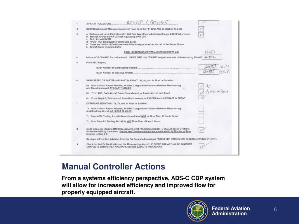 Manual Controller Actions From a systems efficiency perspective, ADS-C CDP system will allow for increased efficiency and improved flow for properly equipped aircraft.