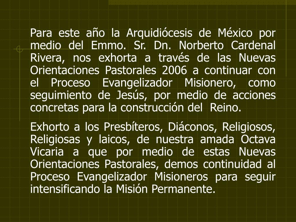 Para este año la Arquidiócesis de México por medio del Emmo. Sr. Dn. Norberto Cardenal Rivera, nos exhorta a través de las Nuevas Orientaciones Pastorales 2006 a continuar con el Proceso Evangelizador Misionero, como seguimiento de Jesús, por medio de acciones concretas para la construcción del Reino. Exhorto a los Presbíteros, Diáconos, Religiosos, Religiosas y laicos, de nuestra amada Octava Vicaria a que por medio de estas Nuevas Orientaciones Pastorales, demos continuidad al Proceso Evangelizador Misioneros para seguir intensificando la Misión Permanente.