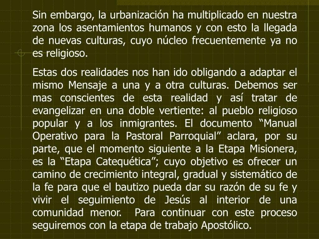 Sin embargo, la urbanización ha multiplicado en nuestra zona los asentamientos humanos y con esto la llegada de nuevas culturas, cuyo núcleo frecuentemente ya no es religioso. Estas dos realidades nos han ido obligando a adaptar el mismo Mensaje a una y a otra culturas. Debemos ser mas conscientes de esta realidad y así tratar de evangelizar en una doble vertiente: al pueblo religioso popular y a los inmigrantes. El documento “Manual Operativo para la Pastoral Parroquial” aclara, por su parte, que el momento siguiente a la Etapa Misionera, es la “Etapa Catequética”; cuyo objetivo es ofrecer un camino de crecimiento integral, gradual y sistemático de la fe para que el bautizo pueda dar su razón de su fe y vivir el seguimiento de Jesús al interior de una comunidad menor. Para continuar con este proceso seguiremos con la etapa de trabajo Apostólico.