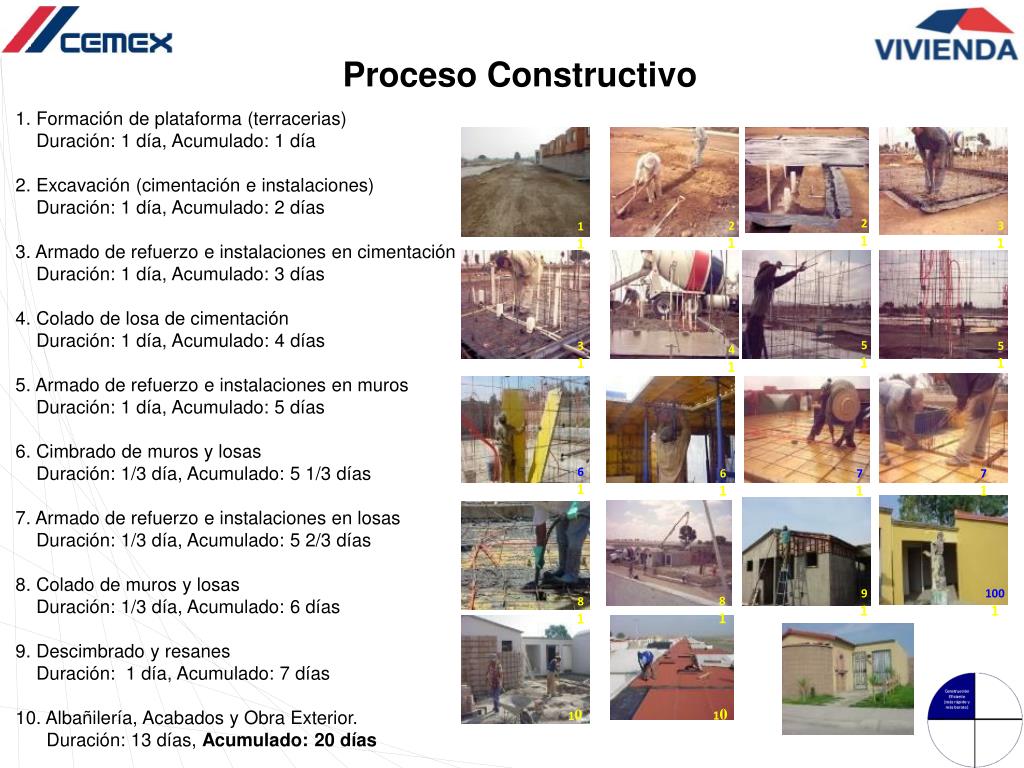 Proceso Constructivo • 1. Formación de plataforma (terracerias) • Duración: 1 día, Acumulado: 1 día • 2. Excavación (cimentación e instalaciones) • Duración: 1 día, Acumulado: 2 días • 3. Armado de refuerzo e instalaciones en cimentación • Duración: 1 día, Acumulado: 3 días • 4. Colado de losa de cimentación • Duración: 1 día, Acumulado: 4 días • 5. Armado de refuerzo e instalaciones en muros • Duración: 1 día, Acumulado: 5 días • 6. Cimbrado de muros y losas • Duración: 1/3 día, Acumulado: 5 1/3 días • 7. Armado de refuerzo e instalaciones en losas • Duración: 1/3 día, Acumulado: 5 2/3 días • 8. Colado de muros y losas • Duración: 1/3 día, Acumulado: 6 días • 9. Descimbrado y resanes • Duración: 1 día, Acumulado: 7 días • 10. Albañilería, Acabados y Obra Exterior. • Duración: 13 días, Acumulado: 20 días 21 21 31 11 51 31 51 41 61 61 71 71 91 1001 81 81 10 10