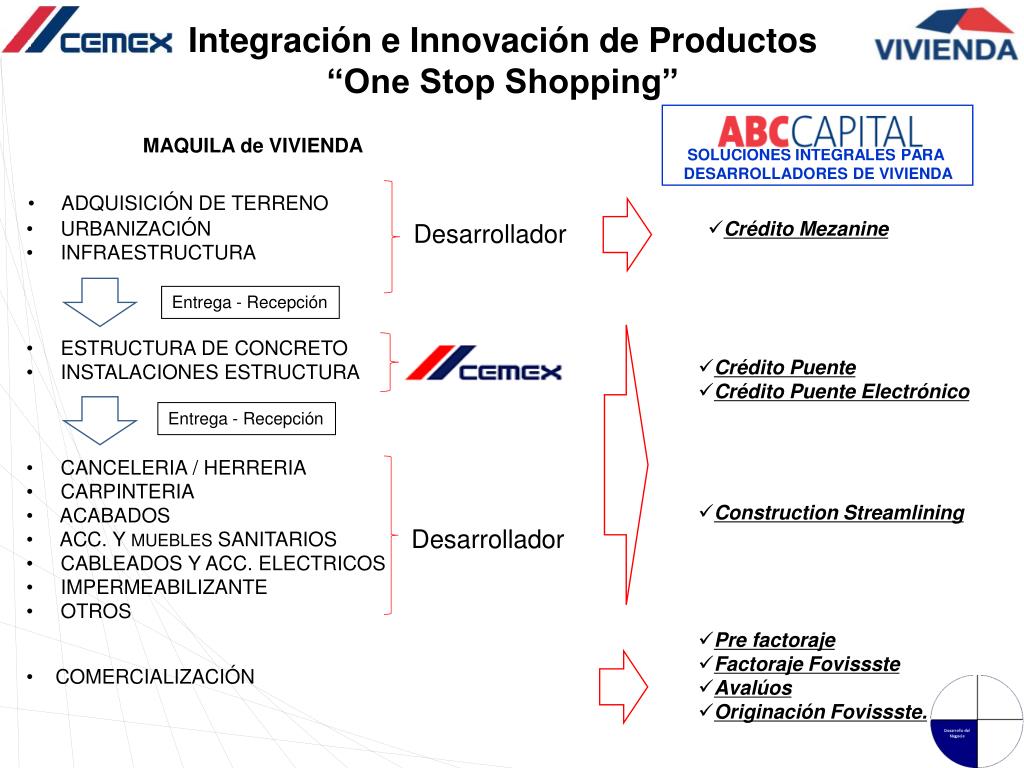 Integración e Innovación de Productos “One Stop Shopping” SOLUCIONES INTEGRALES PARA DESARROLLADORES DE VIVIENDA MAQUILA de VIVIENDA • ADQUISICIÓN DE TERRENO c • URBANIZACIÓN • INFRAESTRUCTURA • ESTRUCTURA DE CONCRETO • INSTALACIONES ESTRUCTURA • CANCELERIA / HERRERIA • CARPINTERIA • ACABADOS • ACC. Y MUEBLES SANITARIOS • CABLEADOS Y ACC. ELECTRICOS • IMPERMEABILIZANTE • OTROS • Crédito Mezanine Desarrollador Entrega - Recepción • Crédito Puente • Crédito Puente Electrónico Entrega - Recepción • Construction Streamlining Desarrollador • Pre factoraje • Factoraje Fovissste • Avalúos • Originación Fovissste. • COMERCIALIZACIÓN
