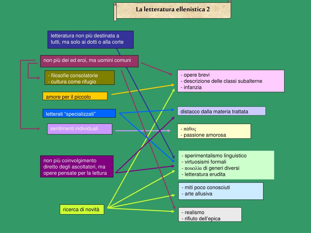 La letteratura ellenistica. La letteratura ellenistica 1. riaffermazione dell’identità greca nei paesi “barbari” conquistati. letteratura non più destinata a tutti, ma solo ai dotti o alla corte. mecenatismo. non più dei ed eroi, ma uomini comuni . dalla πόλις all’individualismo.