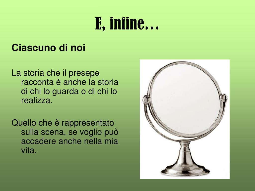 E, infine… Ciascuno di noi La storia che il presepe racconta è anche la storia di chi lo guarda o di chi lo realizza. Quello che è rappresentato sulla scena, se voglio può accadere anche nella mia vita.