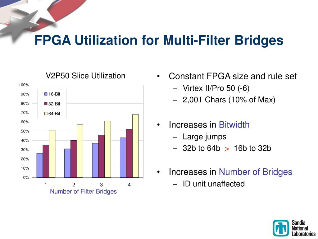 Constant FPGA size and rule set Virtex II/Pro 50 (-6) 2,001 Chars (10% of Max) Increases in Bitwidth Large jumps 32b to 64b > 16b to 32b Increases in Number of Bridges ID unit unaffected FPGA Utilization for Multi-Filter Bridges V2P50 Slice Utilization Number of Filter Bridges