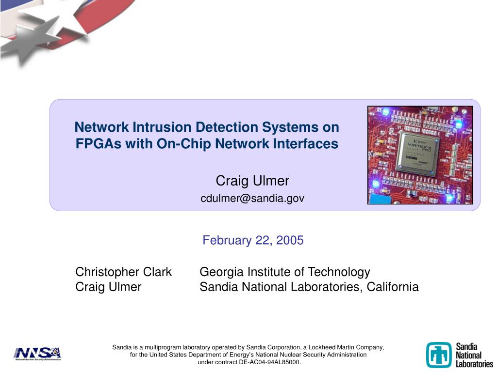 Network Intrusion Detection Systems on FPGAs with On-Chip Network Interfaces Craig Ulmer cdulmer@sandia.gov Christopher Clark Georgia Institute of Technology Craig Ulmer Sandia National Laboratories, California February 22, 2005 Sandia is a multiprogram laboratory operated by Sandia Corporation, a Lockheed Martin Company,for the United States Department of Energy’s National Nuclear Security Administration under contract DE-AC04-94AL85000.