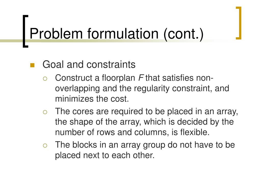 Problem formulation (cont.) • Goal and constraints • Construct a floorplan F that satisfies non-overlapping and the regularity constraint, and minimizes the cost. • The cores are required to be placed in an array, the shape of the array, which is decided by the number of rows and columns, is flexible. • The blocks in an array group do not have to be placed next to each other.