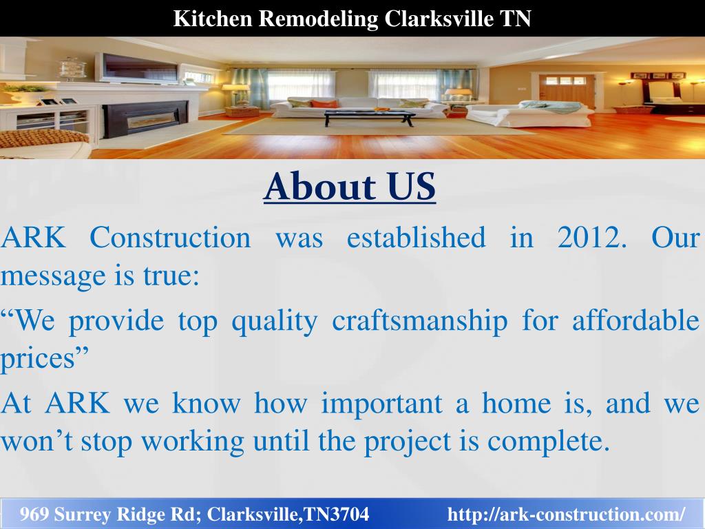 Kitchen Remodeling Clarksville TN About US ARK Construction was established in 2012. Our message is true: “We provide top quality craftsmanship for affordable prices” At ARK we know how important a home is, and we won’t stop working until the project is complete. 969 Surrey Ridge Rd; Clarksville,TN3704 http://ark-construction.com/