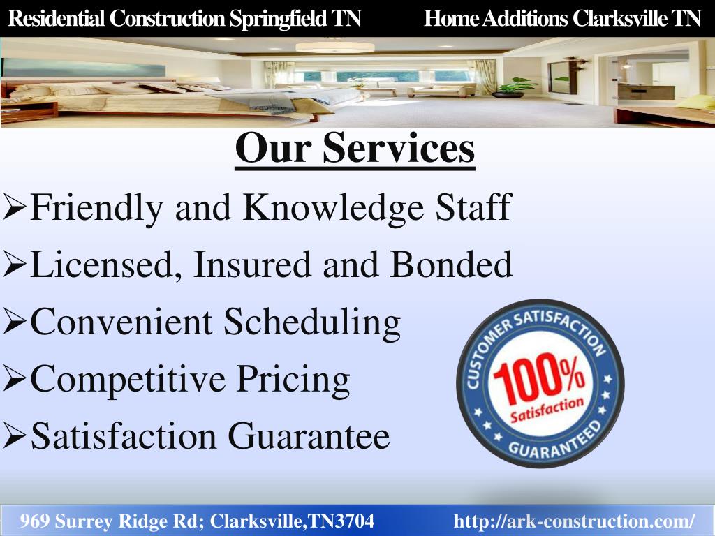 Residential Construction Springfield TNHome Additions Clarksville TN Our Services Friendly and Knowledge Staff Licensed, Insured and Bonded Convenient Scheduling Competitive Pricing Satisfaction Guarantee 969 Surrey Ridge Rd; Clarksville,TN3704 http://ark-construction.com/