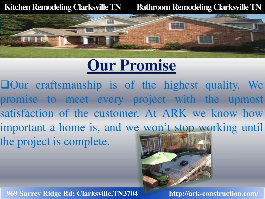Kitchen Remodeling Clarksville TN Bathroom Remodeling Clarksville TN Our Promise Our craftsmanship is of the highest quality. We promise to meet every project with the upmost satisfaction of the customer. At ARK we know how important a home is, and we won’t stop working until the project is complete. 969 Surrey Ridge Rd; Clarksville,TN3704 http://ark-construction.com/