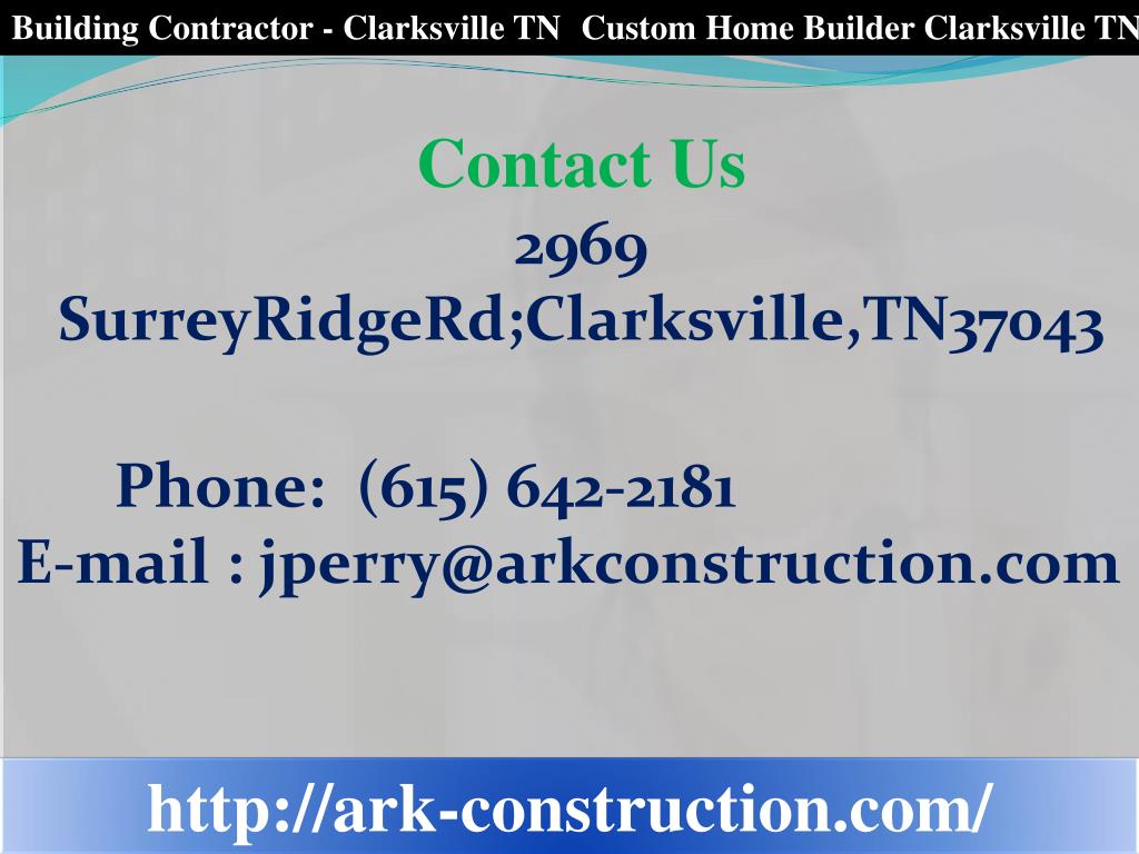 Building Contractor - Clarksville TN Custom Home Builder Clarksville TN Contact Us2969 SurreyRidgeRd;Clarksville,TN37043 Phone: (615) 642-2181 E-mail : jperry@arkconstruction.com http://ark-construction.com/