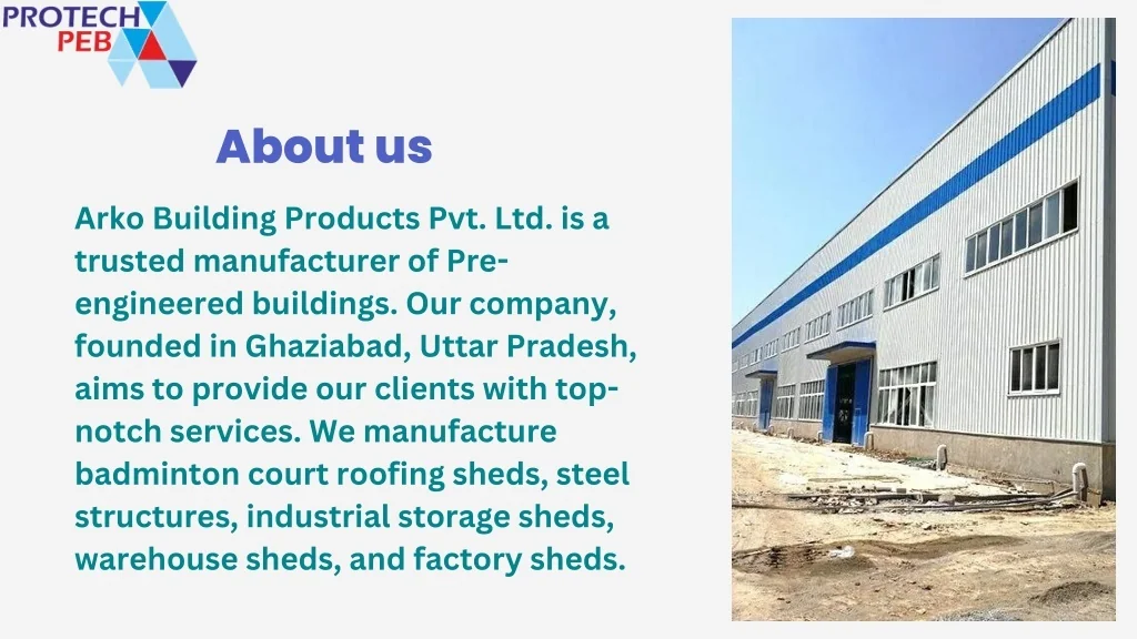 About us Arko Building Products Pvt. Ltd. is a trusted manufacturer of Pre- engineered buildings. Our company, founded in Ghaziabad, Uttar Pradesh, aims to provide our clients with top- notch services. We manufacture badminton court roofing sheds, steel structures, industrial storage sheds, warehouse sheds, and factory sheds.