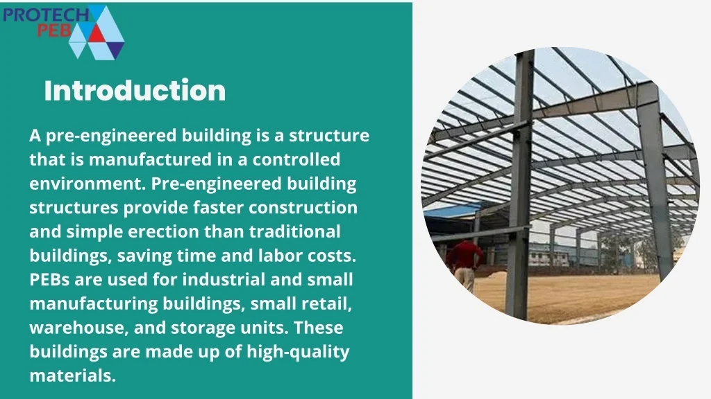 Introduction A pre-engineered building is a structure that is manufactured in a controlled environment. Pre-engineered building structures provide faster construction and simple erection than traditional buildings, saving time and labor costs. PEBs are used for industrial and small manufacturing buildings, small retail, warehouse, and storage units. These buildings are made up of high-quality materials.